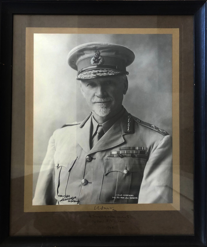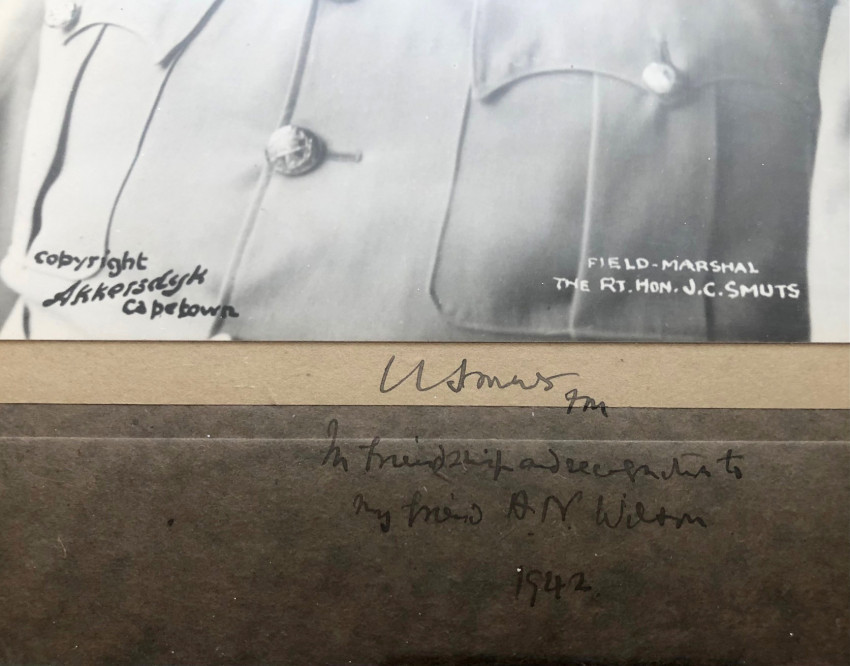 A fine large double mounted and framed wartime photograph of General Smuts with an important inscription. The original signed ink inscription in Smuts's hand (on the lower mounts) reads: J.C. Smuts FM/In Friendship and recognition to/ My friend A.M. Wilson/1942. The lower part of the image is annotated 'Copyright/Akkersdyk/Caoetown' in black and 'Field-Marshall J.C. Smuts' in white. The image measures 36 x 28.5cms. and in the frame 52 x 42.5cms. The photograph is in very good condition. The contermporary black frame has some slight signs of wear.