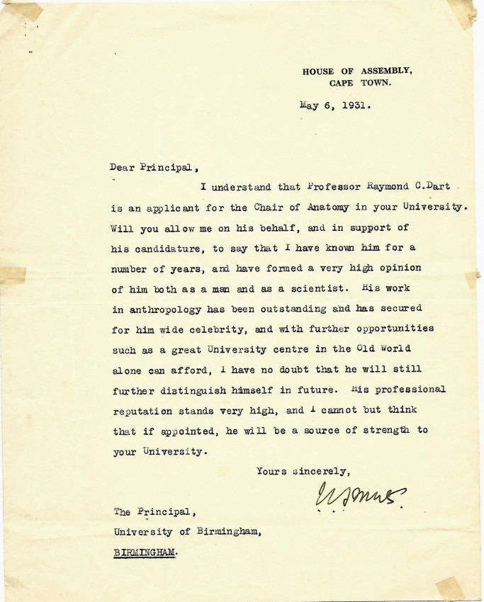 A fine 1pp. typed letter on House of Assembly letterhead dated May 6, 1931 and addressed to the Principal, University of Birmingham. Circa 120 words, concerning Raymond Dart. Dart had applied for the post of Chair of Anatomy at Birmingham University. Smuts supports Dart's candidature and praises him "I have known him for a number of years, and have formed a very high opinion of him both as a man and as a scientist. His work in anthropology has been outstanding and has secured for him wide celebrity.........I have no doubt he will still further distinguish himself in future".