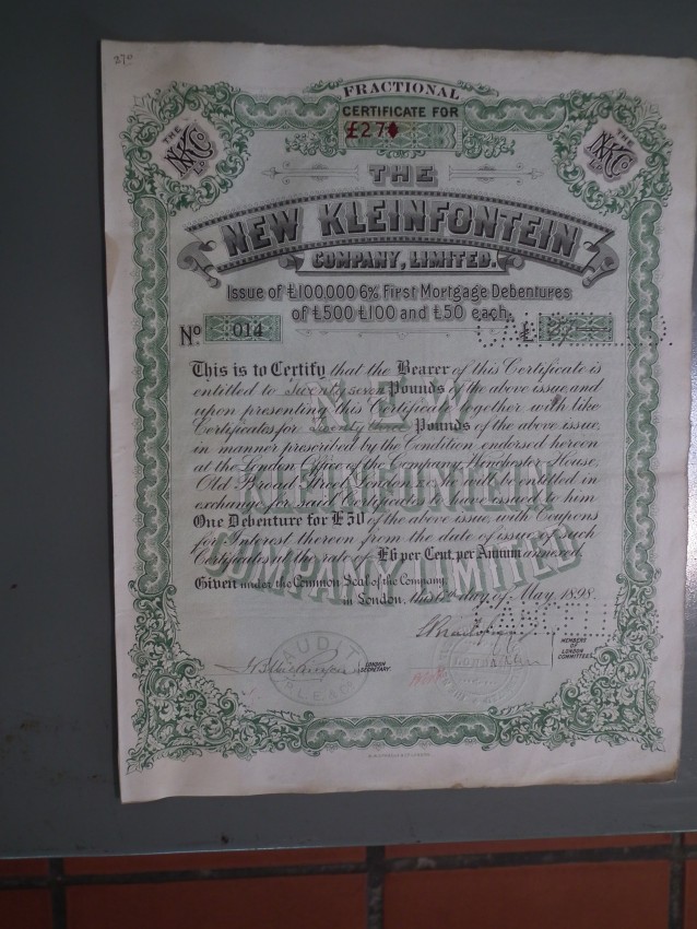 Crushing at Kleinfontein Mine began in 1889 with a 25-stamp mill. The Chimes, Benoni, Kleinfontein and Van Ryn Mines all ran into difficulties in 1890. Kleinfontein Mine closed down that year.