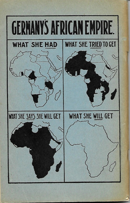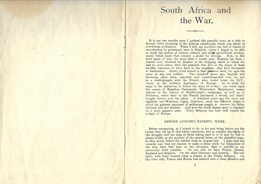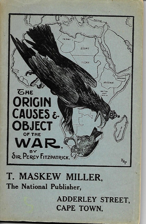 1. Sir Percy Fitzpatrick. The Origin, Causes & Object of The War. (1914). T.Maskew Miller. Cape Town. A 59pp. stapled booklet in the original illustrated wraps. SABIB. Vol.2, Page 250. With coloured folding map of Europe and Africa tipped in. Wrappers split at the top and bottom of the spine otherwise a very good copy.