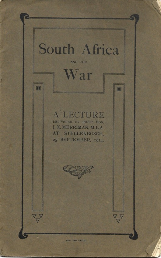 2. J.X. Merriman. South Africa and The War. (1914). Cape Times Limited. Cape Town. A 15pp. stapled pamphlet in the original brown printed wraps. A lecture delivered by Merriman at Stellenbosch, 25 September, 1914, Slight fraying and dog earring at corners. About very good.