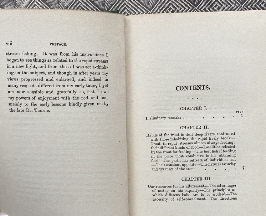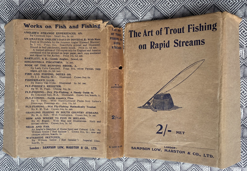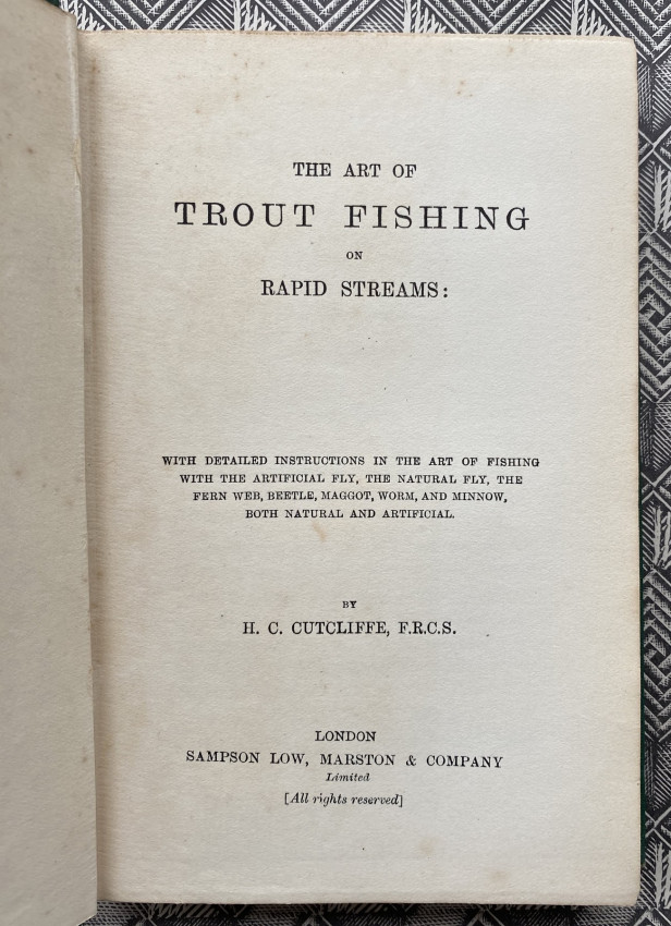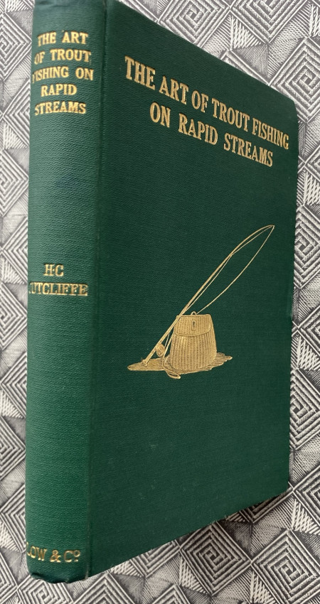 Henry Charles CUTCLIFFE (1833-1873). The Art of Trout Fishing on Rapid Streams: with detailed instructions in the art of fishing with the artificial fly, the natural fly, the fern web, beetle, maggot, worm and minnow, both natural and artificial. London: Sampson Low, Marston, Searle, & Rivington Limited, [no date but circa 1900?]. Small octavo (7 1/8 x 4 1/2 in; 180 x 115mm). Pp. [i-]xi[-xii; 1-]212. (Some browning, marginal in the main). Original green cloth, gilt titling and rod and creel on upper cover, brown paper dust-jacket (with author’s initials incorrect on backstrip). (Light approximately vertical crease to lower cover, dust-jacket with damage to backstrip [see images], but otherwise quite good) Provenance: B.H. Bird (signature). A later edition of a popular and quite common book, but here with the very rare dust-jacket. The first edition was published in South Molton in Devon in 1863, and there were at least three later editions/issues before the appearance of the present edition/issue. This was Cutcliffe's only published work on angling. At the time of his early death the author was a Surgeon-Major in the army of Bengal and professor of surgery in Calcutta, but his family’s roots were in North Devon where he perfected the techniques described in this work
