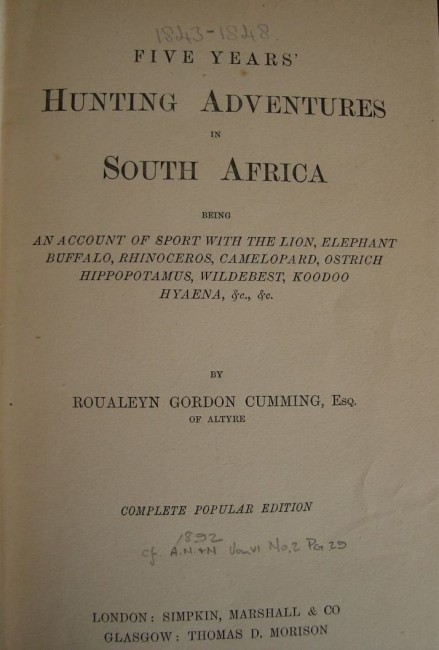'Being an account of sport with the lion, elephant, buffalo, rhinoceros, camelopard, ostrich, hippopotamus, wildebest, koodo, hyaena etc. etc.'