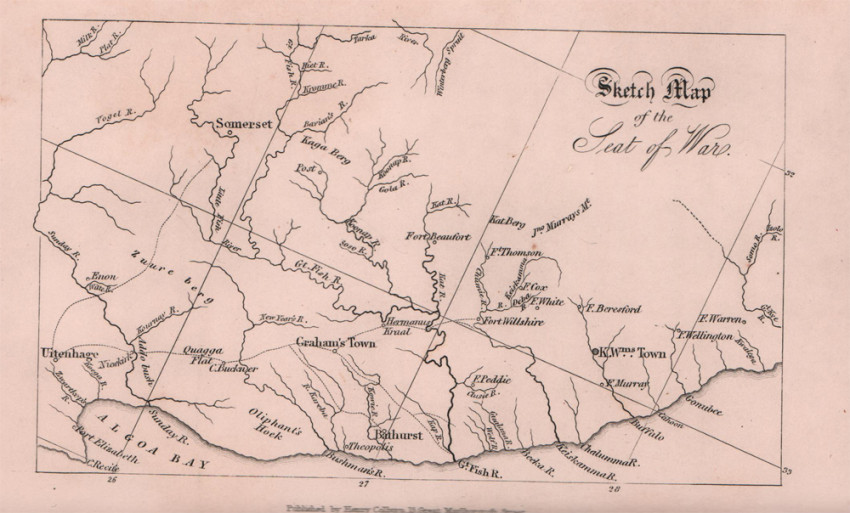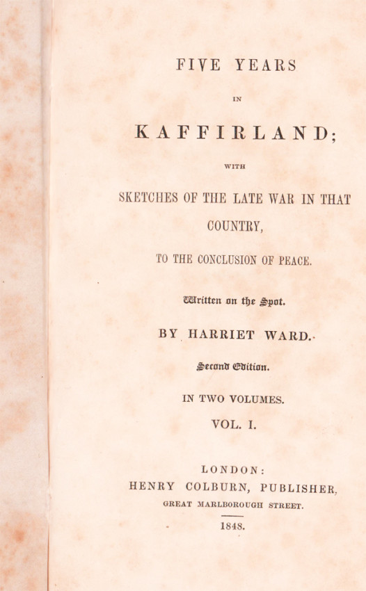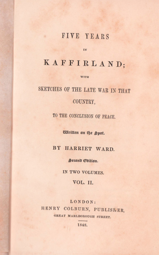 Mendelssohn (Sidney) South African Bibliography volume 2 page 582 -583: An account of the " war of the axe " written by the wife of an officer in the 91st regiment, who resided on the frontier during the period of the hostilities. Mrs. Ward observes that much mischief had resulted from the misrepresentation of affairs in Kaffir-land by interested persons, In the appendix to Volume II. will be found a manifesto published by Sir Harry Smith in reference to his proclamations, declaring the " Sovereignty of Her Majesty " over the territory beyond the Orange River.