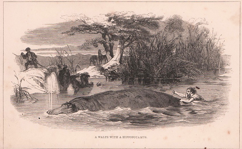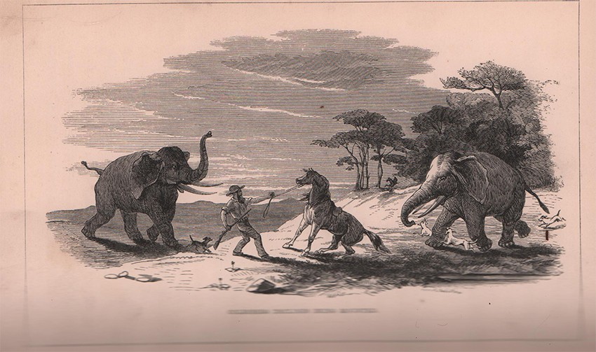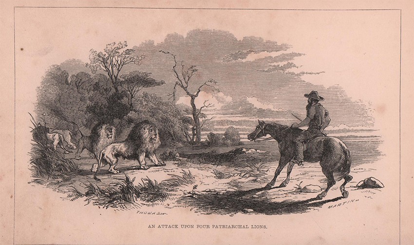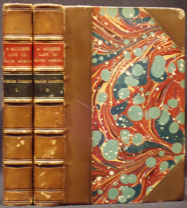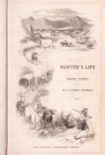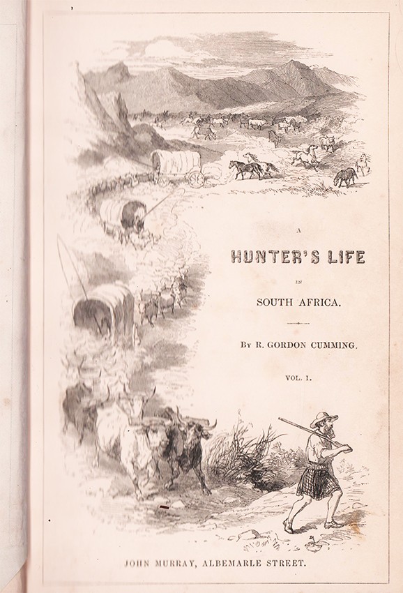 Mendelssohn (Sidney) South African Bibliography volume 1, page 399: A hunter and sportsman from boyhood, Cumming was in his element in South Africa, which was a regular hunter's paradise in the first half of the nineteenth century. His youth was passed in the county of Moray, and after finishing his education at Eton, he joined the 4th Madras Light Cavalry. In 1839 he sailed for India and, touching at the Cape, had a foretaste of the splendid sport that he was able to enjoy there in later years. The climate of India did not agree with him, and he left that country and spent a few years hunting in Scotland and America, where he obtained a commission in the Royal Veteran Newfoundland Companies. He exchanged into the Cape Riflemen in 1843, and after some uneventful months spent under Colonel Somerset in Kaffraria, he sold out of the army and decided " to penetrate into the interior farther than the foot of civilised man had yet trodden to vast regions which would afford abundant food for the gratification of the passion of my youth, the collecting of hunting trophies and objects of interest in science and natural history. Cumming started on October 23, 1843, from Grahamstown, in the direction of Albany and the Great Fish River, and passing through Cradock, soon found himself in a country which was absolutely teeming with game. He got on well with the Boers. After a surfeit of springbok hunting, the author proceeded to the Orange River and Griqualand West, and soon after met Messrs. Murray and Oswell, and later, on arriving at Kuruman, was welcomed by Mr. Moffat. After a few days' stay at Kuruman he recommenced his travels, and soon after met David Livingstone, who gave him plenty of information respecting hunting and exploring. Gordon Cumming appears to have hunted every species of South African fauna, and to have enjoyed an amount of sport almost unique even amongst the mighty hunters of Africa. The narrative is valuable for the account of the state of the country at this period, as well as for the excellent description afforded of the natives of the interior, and of the up-country Boers, while the interesting zoological and botanical notes give added value to the work. After five years of incessant travel the author returned to England, taking the Cape waggon which had accompanied him throughout his journeys, and his large collection of trophies, the whole weighing about thirty tons.