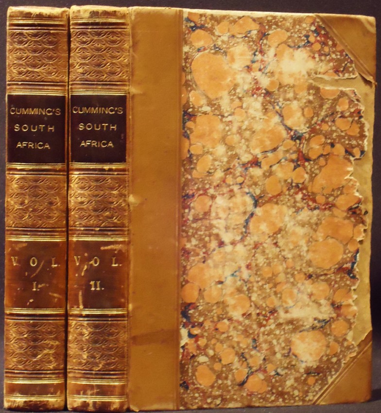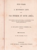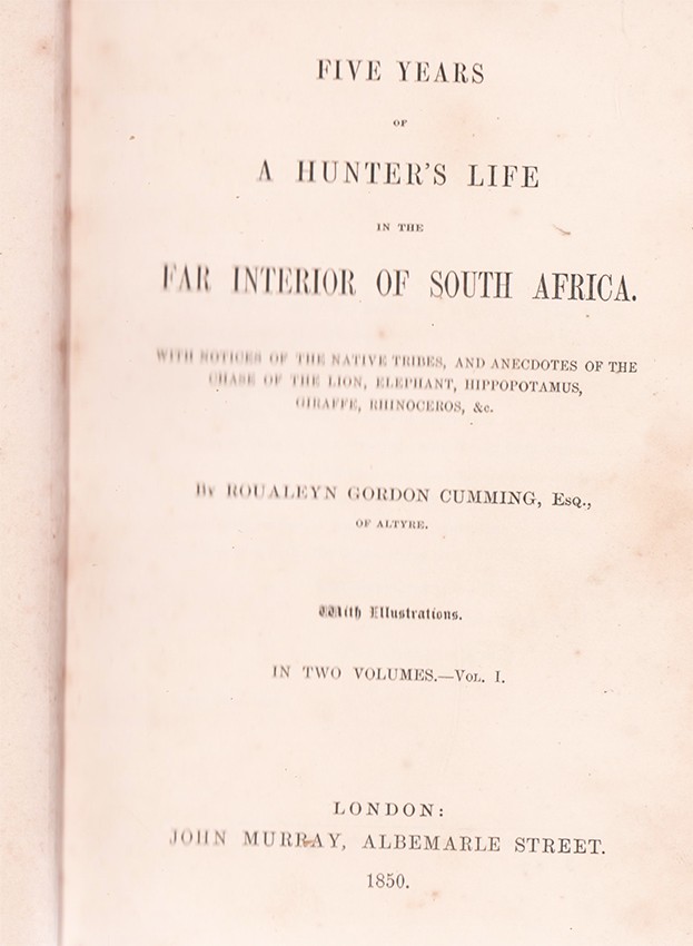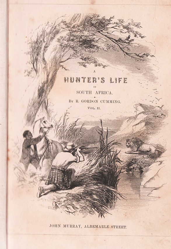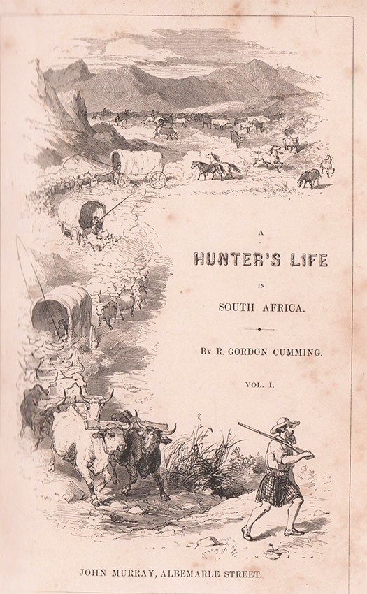 Mendelssohn (Sidney) South African Bibliography volume 1, page 399: A hunter and sportsman from boyhood, Cumming was in his element in South Africa, which was a regular hunter's paradise in the first half of the nineteenth century. His youth was passed in the county of Moray, and after finishing his education at Eton, he joined the 4th Madras Light Cavalry. In 1839 he sailed for India and, touching at the Cape, had a foretaste of the splendid sport that he was able to enjoy there in later years. The climate of India did not agree with him, and he left that country and spent a few years hunting in Scotland and America, where he obtained a commission in the Royal Veteran Newfoundland Companies. He exchanged into the Cape Riflemen in 1843, and after some uneventful months spent under Colonel Somerset in Kaffraria, he sold out of the army and decided " to penetrate into the interior farther than the foot of civilised man had yet trodden to vast regions which would afford abundant food for the gratification of the passion of my youth, the collecting of hunting trophies and objects of interest in science and natural history.
