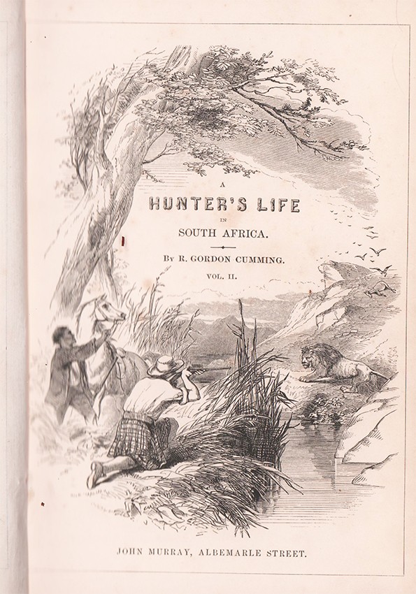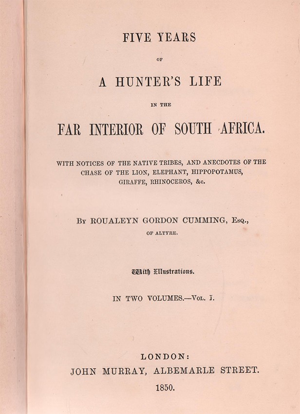 Mendelssohn (Sidney) South African Bibliography volume 1, page 399: A hunter and sportsman from boyhood, Cumming was in his element in South Africa, which was a regular hunter's paradise in the first half of the nineteenth century. His youth was passed in the county of Moray, and after finishing his education at Eton, he joined the 4th Madras Light Cavalry. In 1839 he sailed for India and, touching at the Cape, had a foretaste of the splendid sport that he was able to enjoy there in later years. The climate of India did not agree with him, and he left that country and spent a few years hunting in Scotland and America, where he obtained a commission in the Royal Veteran Newfoundland Companies.