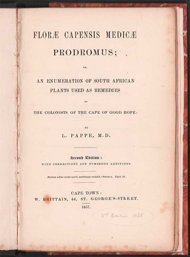 Beinart (William) The Rise of Conservation in South Africa: Settlers, Livestock and the Environment 1770-1950, page 74, Oxford University Press, 2003. ‘Ludwig Pappe arrived in 1831 to establish a medical practice in Cape Town. Born in Germany and qualified from Leipzig, he saw botany as he leading interest. He also worked in von Ludwig’s garden, formed close links with visiting botanists such as Harvey, published a list of Cape plants in 1833-34, and became a foundation member of the Literary and Scientific Institution. He helped to preserve and develop von Ludwig’s collection, and continued to chart the extraordinary range of plants at the Cape. A definitive publication of Cape plants remained a priority for him, and he sent materials to Kew, and to Harvey for the Flora Capensis. But, as Richard Grove has argued, Pappe was important not only as a botanist who stayed, but because of his understanding of environmental change. In 1847 Pappe published a small volume of the medicinal use of plants. He usually noted whether berries or fruit of a species was edible and sometimes mentioned Khoihkoi names and uses.’