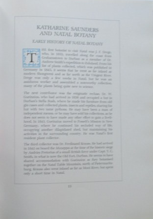 Hardback with dustcover over original dark green rexine boards, with Tongaat gilt vignette to upper board. Signed inscription to front endpaper, Half Title, Frontispiece, Title, Preface, Contents, Plants Named in honour of Katharine Saunders and members of her family, Katharine Saunders and Natal Botany, Biographical and other Notes, Map. 343 pages text, with 106 colour plates, data and Index.
