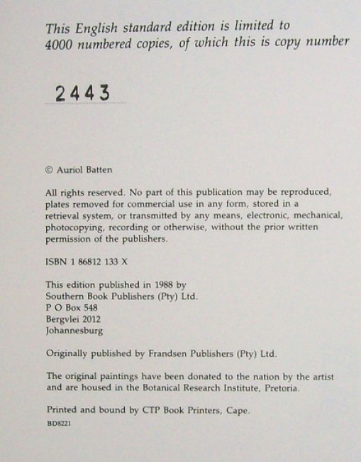 This title was originally published by Frandsen Publishers, who could not complete the task and the print run was completed by Southern Publishers. Since the publisher changed, this is technically a second edition. Copy number 2443 of the English edition, limited to 4,000 copies. Original dust jacket. Original dark green simulated leather boards with gilt titling on the spine. Dark green end papers. xv prelims, 401 pages followed by the index, etc., which takes up the pagination from the prelims to page xxxii, 100 colour plates by Auriol Batten.