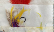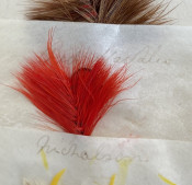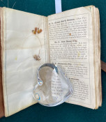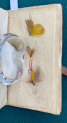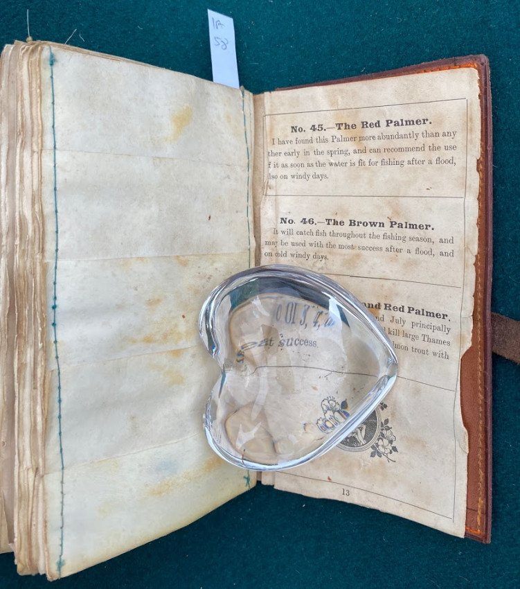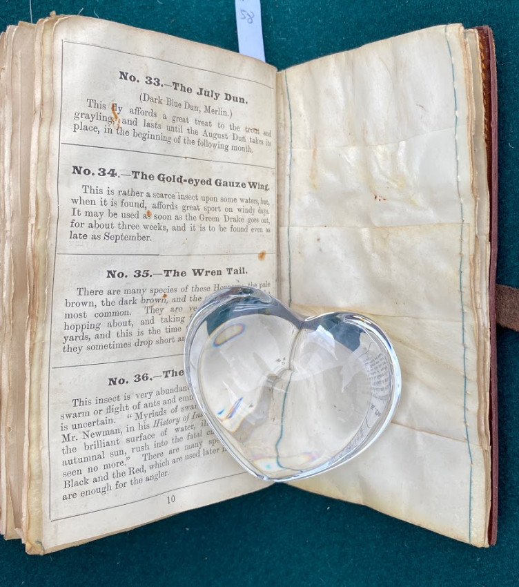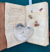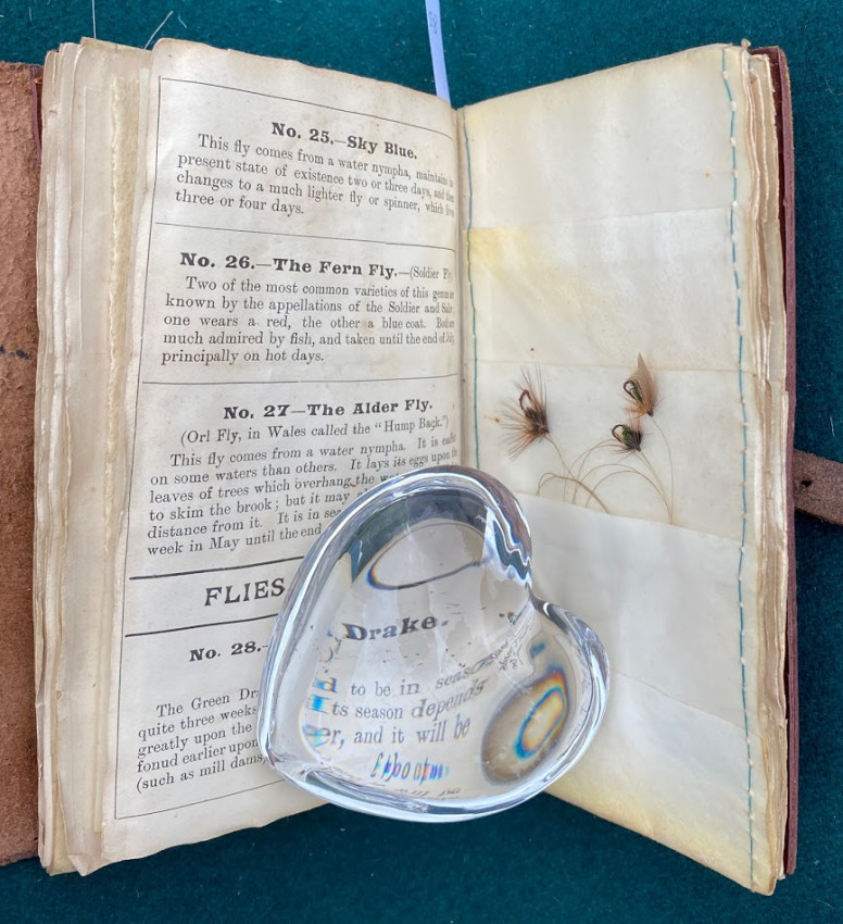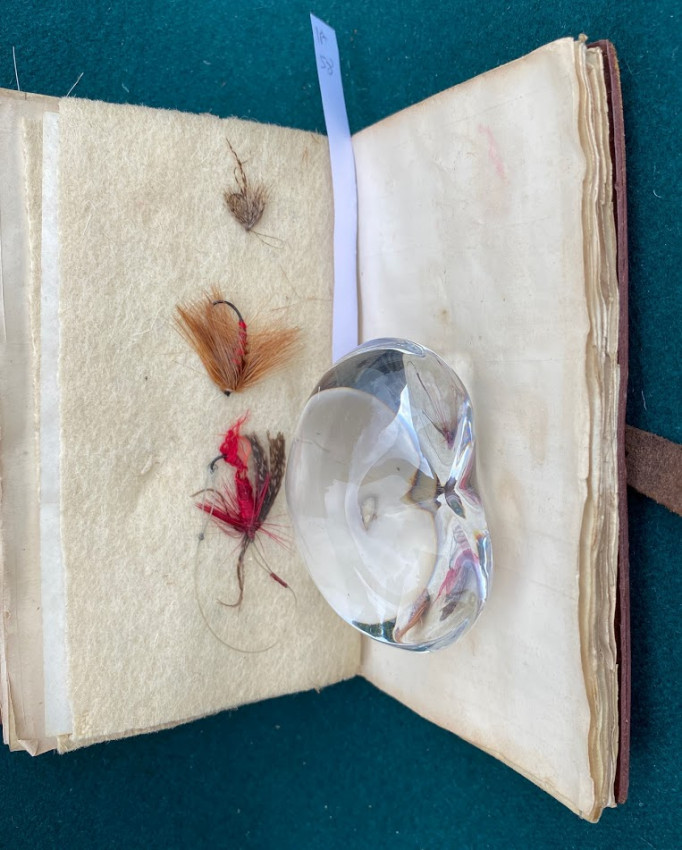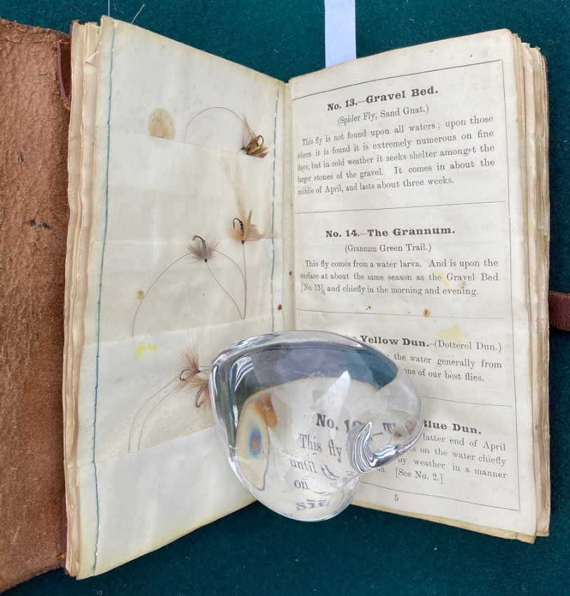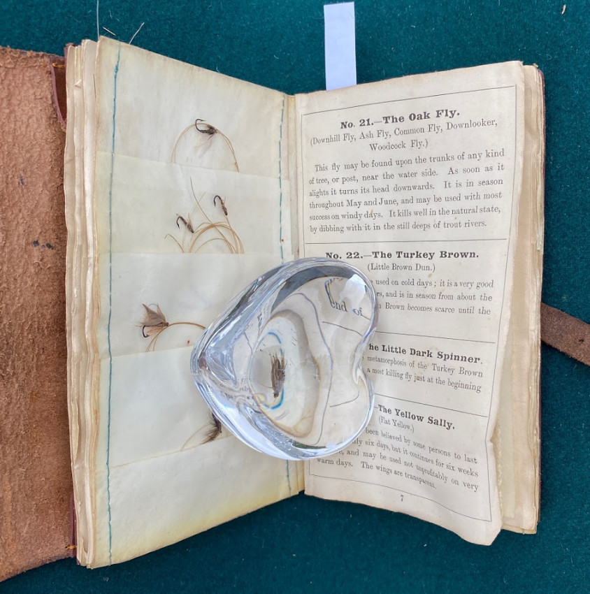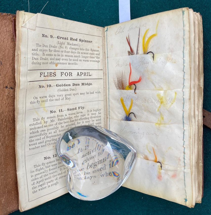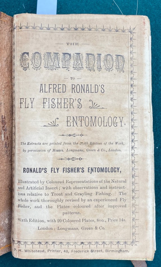 The Companion to Alfred Ronald’s [sic.] Fly Fisher's Entomology. The Extracts are printed from the Sixth Edition of the Work... Birmingham: P.H. Whitehead, printer, 48, Frederick Street, [no date but 1862 or later]. Small octavo (6 1/4 x 3 1/2in: 159 x 89mm). Letterpress title and 12pp. text on 8 leaves, these leaves interleaved with six leaves made of vellum strips sewn together to form four pockets per page, at the centre a pair of 'leaves’ of white felt, flanking a single vellum leaf. The pockets with a total of 60 actual examples of eyeless flies (possibly 19th century?), most with attached gut. Condition of contents: first and last leaf toned, last leaf also somewhat creased, occasional light 'crinkeling' to the vellum. Original wallet-style brown calf, with calf and metal strap, an internal pocket at either end. Condition of binding: wear to strap, stitching weak, but generally witn a nice 'old club armchair' patina (see images).