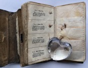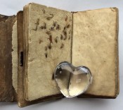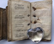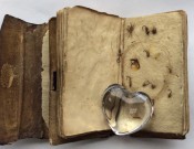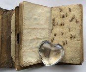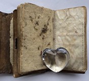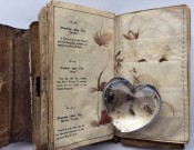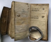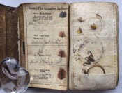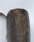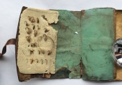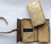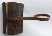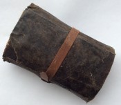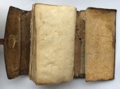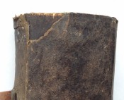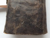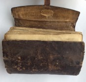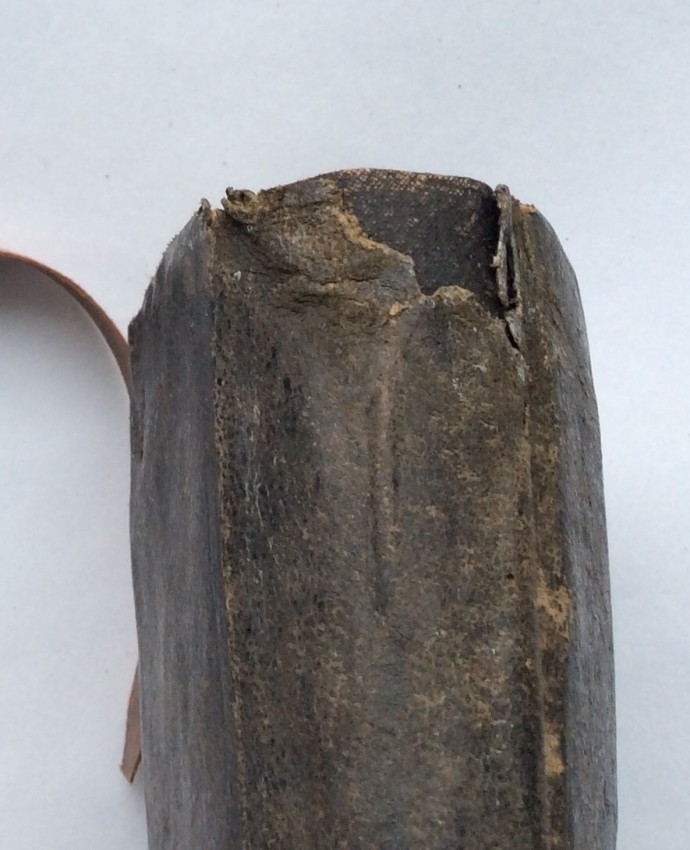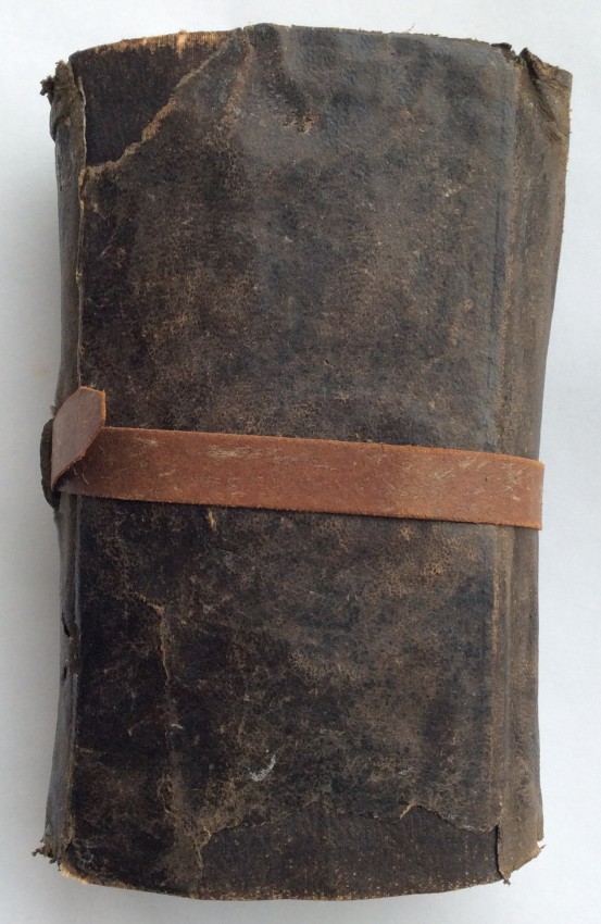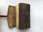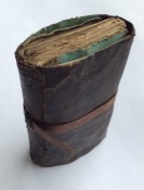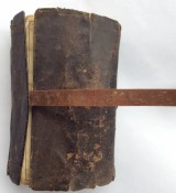 Condition: contents with some old surface soiling, flies with damage and rusting consistent with age; binding well used, with soiling, tears and repairs, some insect damage, neat repairs using old materials, the strap a replacement.
