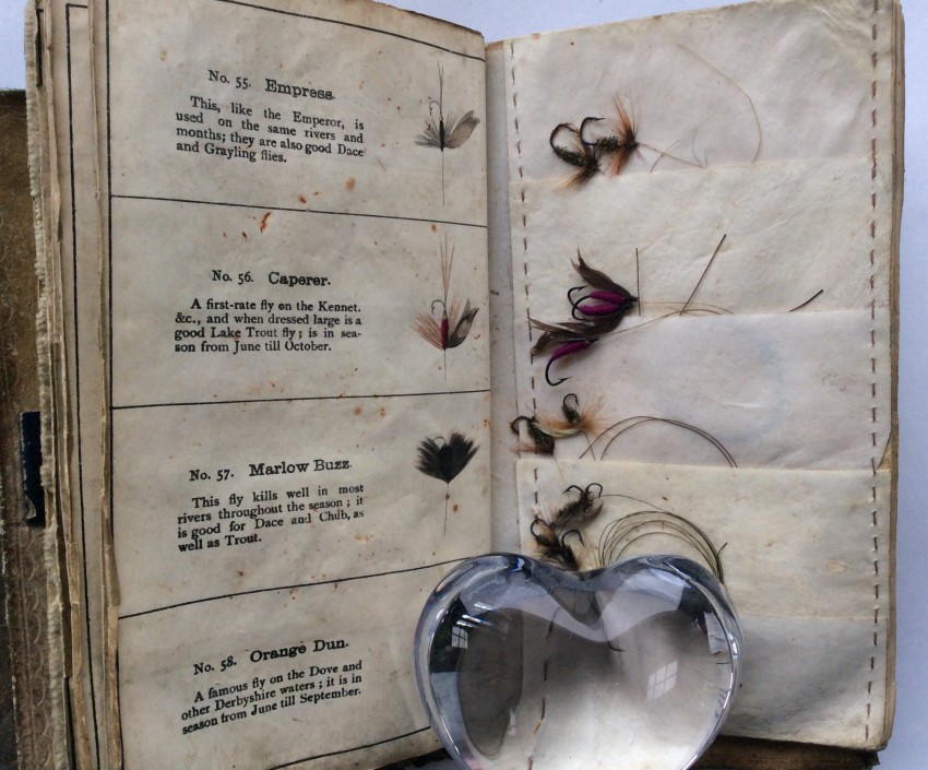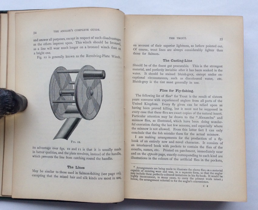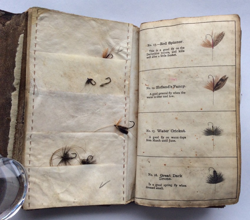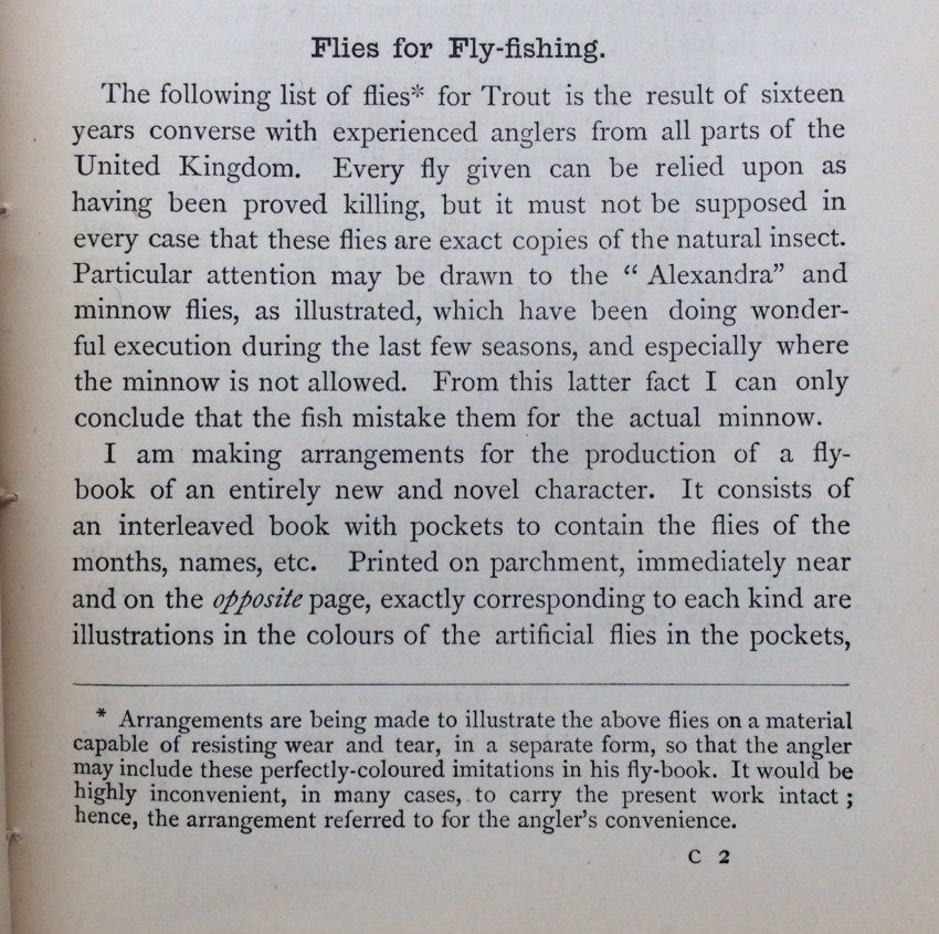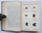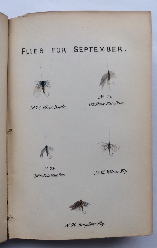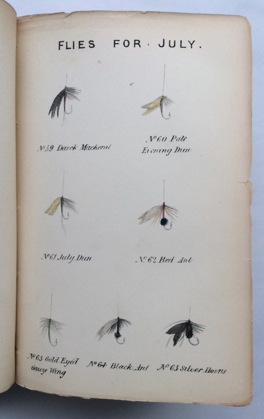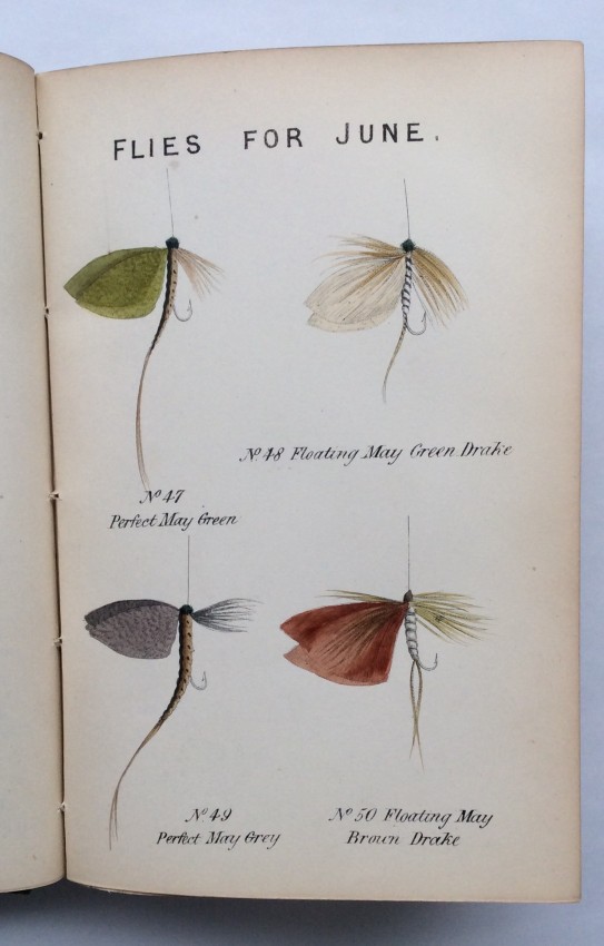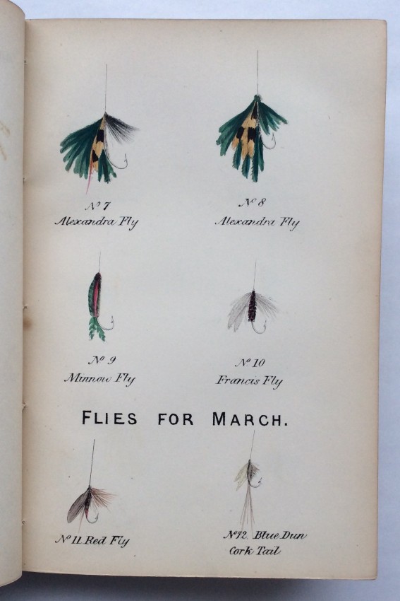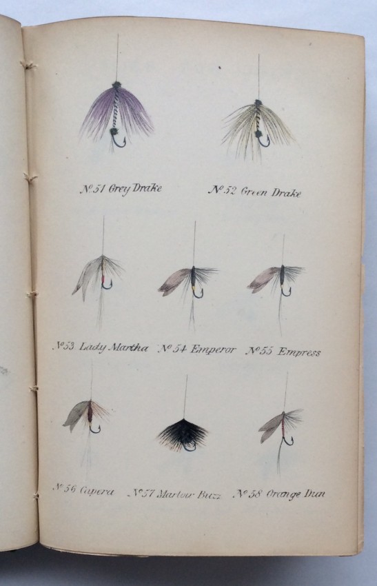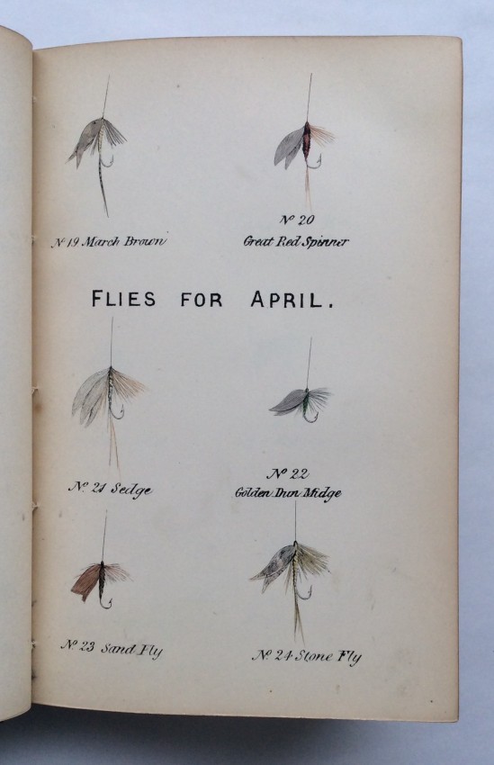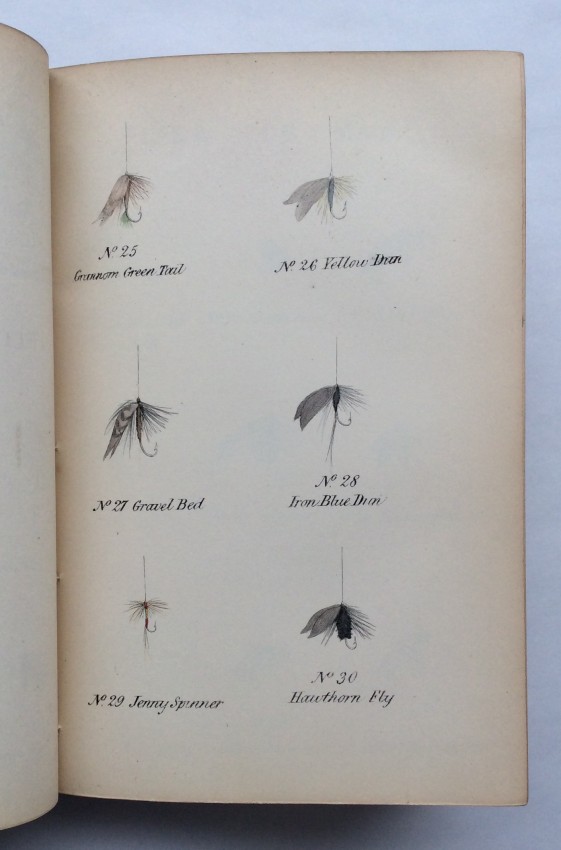 The author notes on p. 35: 'I am now making arrangements for the production of a fly-book of an entirely new and novel character. It consists of an interleaved book with pockets to contain flies of the months, names, etc. Printed on parchment [i.e. vellum], immediately near and on the opposite page, exactly corresponding to each kind are shown illustrations in colours of the artificial flies in the pockets'. Westwood & Satchell p.xx