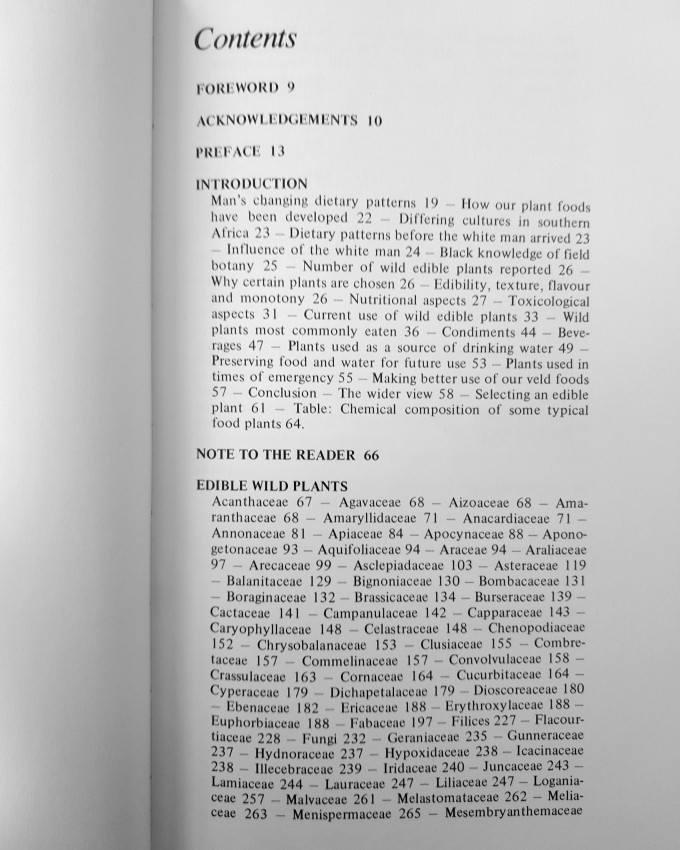 From the sleeve: "Food from the Veld describes over a thousand wild plants which are known to be eaten in southern Africa, ranging from delicious and highly-prized herbs and fruits to roots and tubers providing food or water during times of famine or in desert areas.
