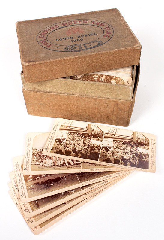 Set of 72 stereoscopic cards (180 x 90 mm) with views covering many aspects of the Anglo-Boer War. Housed in a box covered in brown cloth, with the title in red on the upper cover, a good set.