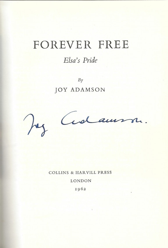 London, Collins and Harvills Press, 1962. 1st Edition. 192 pages. Very good illustrated cloth covers in very good slightly chipped pictorial dust jacket. Contents fine. Pictorial endpapers. Numerous black and white and coloured ills. Signed on the title pages by Joy Adamson.