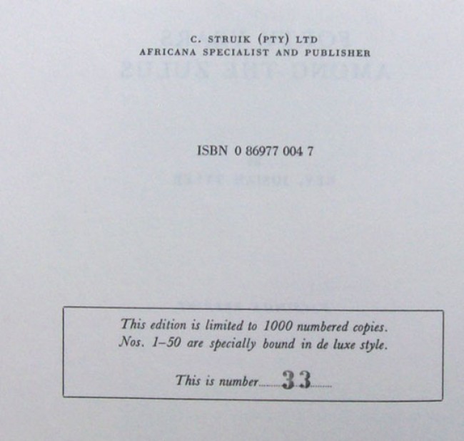 This is the 37th volume in the Africana Collectanea Series. This title was limited to 1,000 numbered copies, of which copy numbers 1 to 50 were specially bound in the "de luxe" style. Original brown leather spine with a green title label on the spine with gilt titling and the publisher's device on the upper board. 6 prelims followed by the facsimile of the 1891 Boston, edition with 305 pages, black and white illustrations.