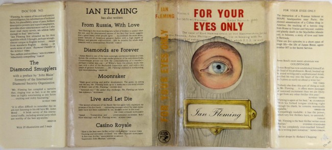 2. For Your Eyes Only. 1960. Signature on the front pastedown and bookseller's label on the lower ffep. with some offsetting to the verso of the page. Otherwise a tight clean very good copy. In an about very good dw. which has a sunned spine (red faded to yellow as is frequently the case) and some edge wear with some very minor chips and tears.