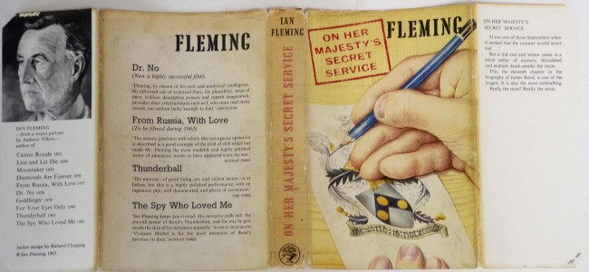 4. On Her Majesty's Secret Service. 1963. Small neat signature on front pastedown, ow. this is a very good plus copy in a very good dw. which has some edge wear with minor chipping and a 3mm. hole at the lower end of the spine. Please see the scans which give a clear idea of dw. condition.