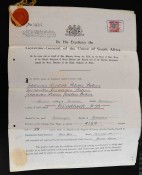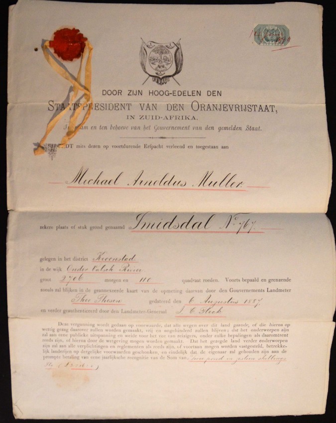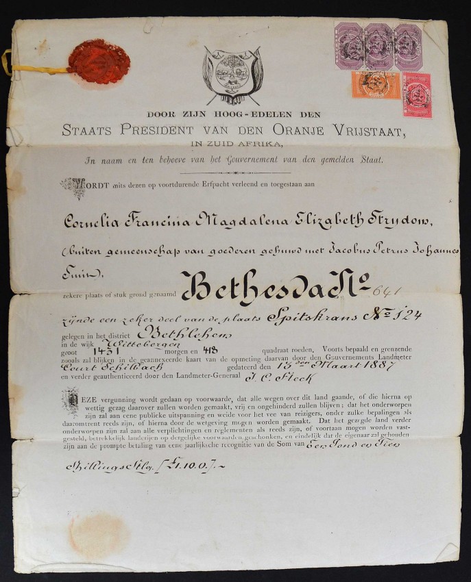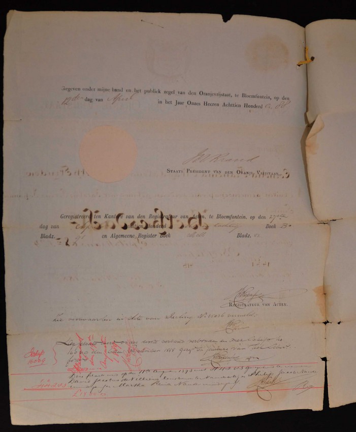 1. Oranje Vrijstaat. Bethestadt district Bethlehem. Signed by President J.H. Brand and dated 12th. April 1888. (Brand was to die 3 months later in July 1888 whilst in Office). Moderate fraying and splitting of the folds.