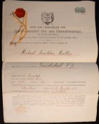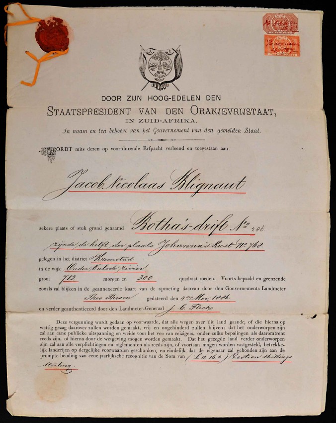 2. Oranje Vrijstaat. Botha's-drift. District Kroonstad. Signed by President F.W. Reitz and dated 20th. September 1778. Slight wear at folds but very good.
