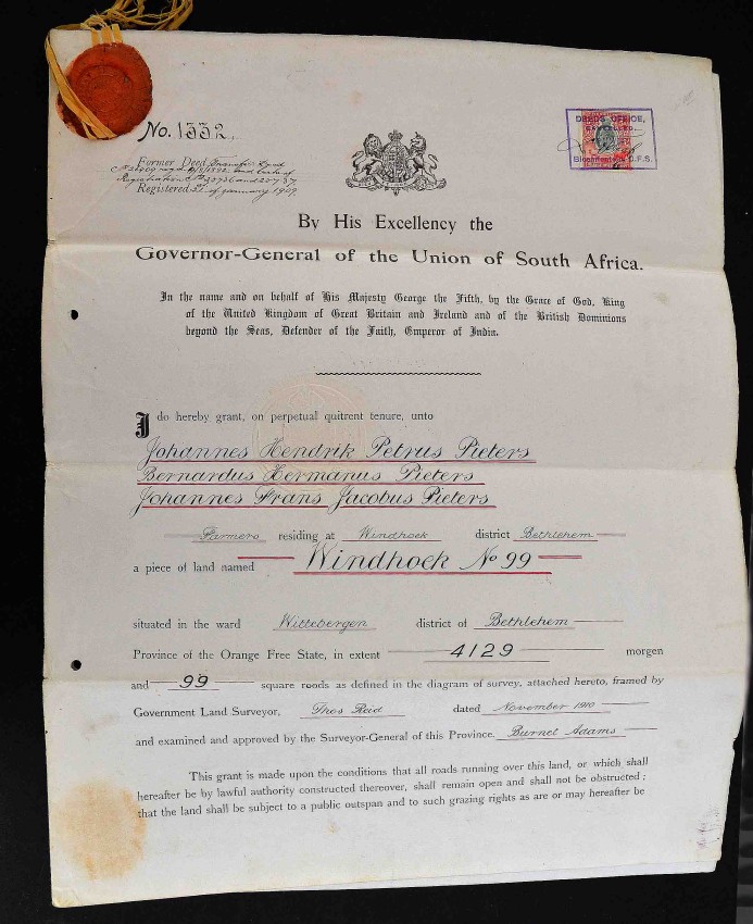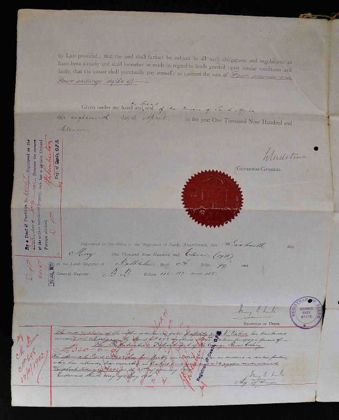 4. Union of South Africa. Wittebergen, District Bethlehem. Signed by Viscount Gladstone, the First Governor General of South Africa. Dated April 1911. In very good condition.