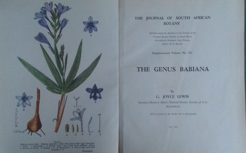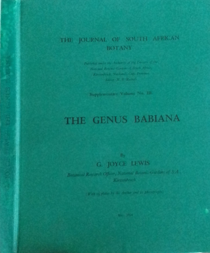 #1. Lewis, C Joyce. The Genus Babiana. Journal of South African Botany, Supplementary Volume No III, with 23 plates by the author and 10 photographs, 1959. Quarto, green cloth-boards with black lettering to the upper panel and spine, plain endpapers, the copy of the noted botanis Janet M Gibson, 148 pp of text and bibliography. A fine copy
