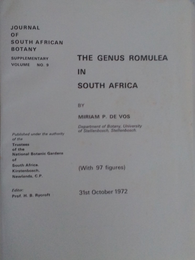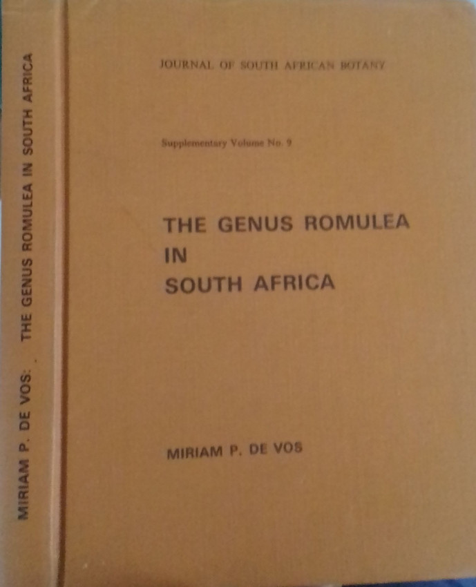 #3. De Vos, Miriam P. The Genus Romulea in South Africa. Journal of South African Botany, Supplementary Volume No 9, 1972. Quarto, tan cloth-boards with black lettering to the upper panel and spine, plain endpapers, iii/307 pp of prelims, text with 96 b/w figures in the text, bibliography and index. A fine copy