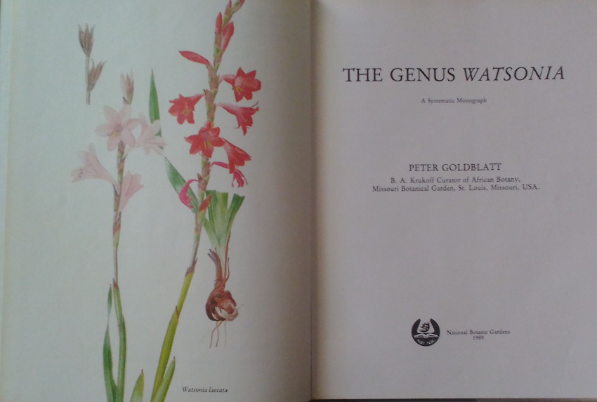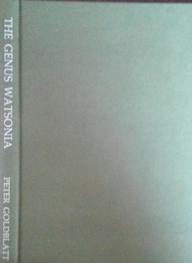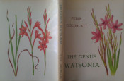 #4. Goldblatt, Peter. The Genus Watsonia. A Systematic Monograph. Annals of Kirstenbosch Botanic Gardens, Vol 19, 1989. Quarto, unclipped laminated illustrated dustjacket, green cloth-boards with silver lettering to the spine, plain endpapers, vii/148 pp of prelims, text with figures and 26 inserted colour plates on art paper, bibliography and index. A fine copy