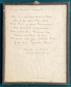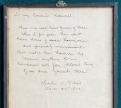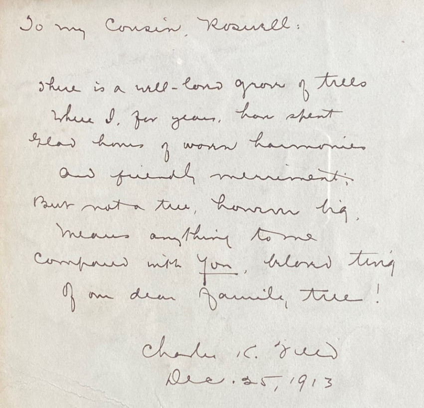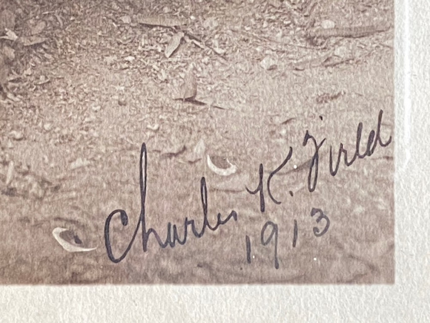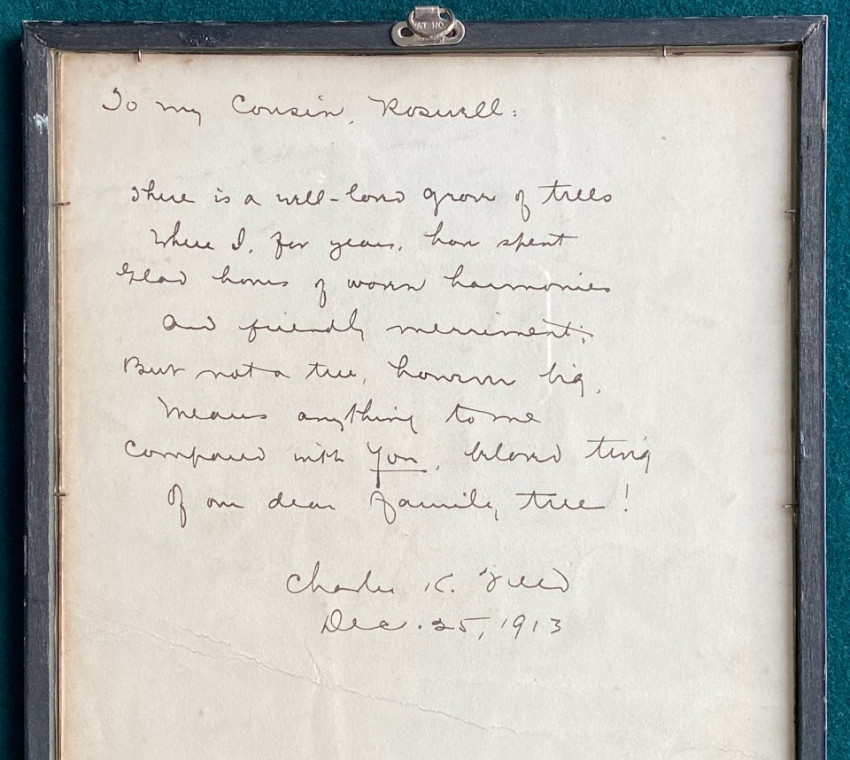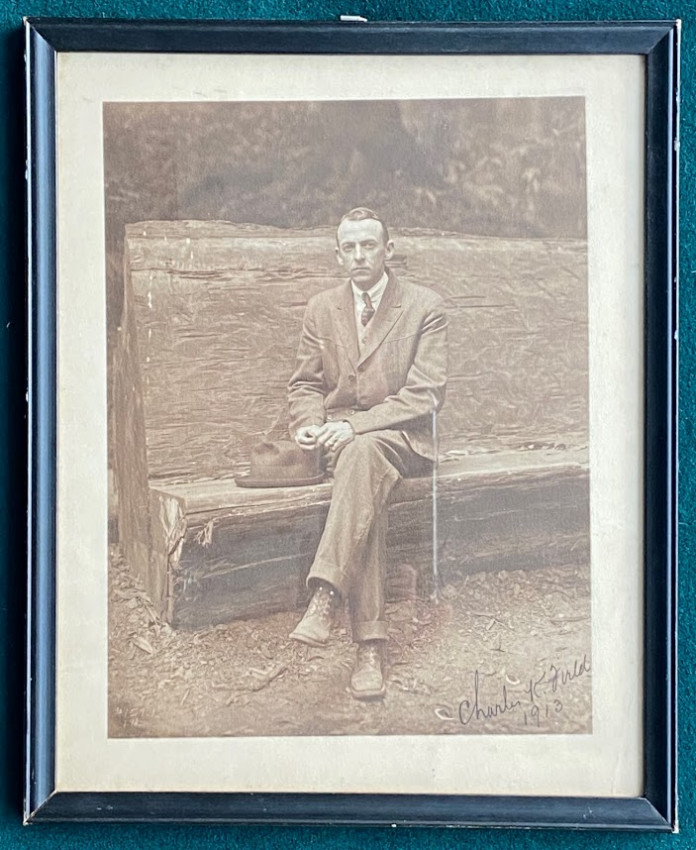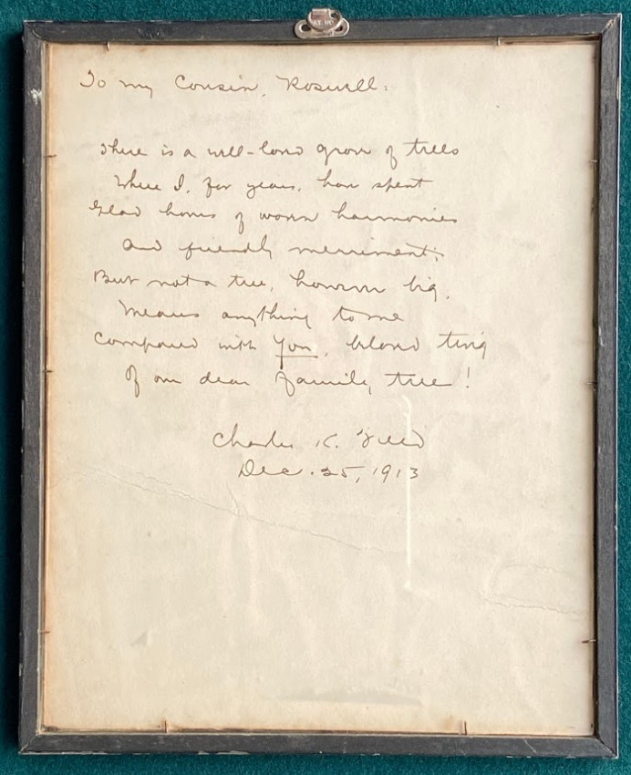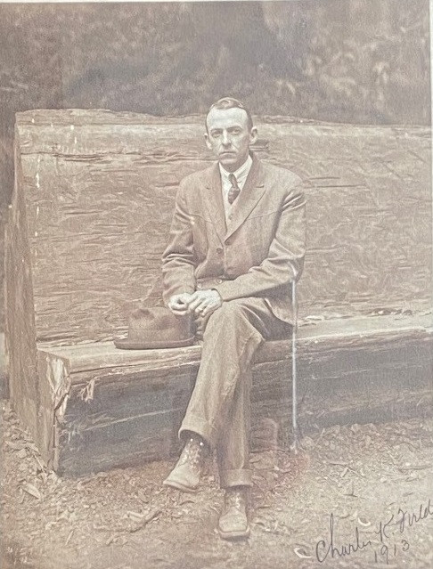 BOHEMIAN GROVE, California. – [Charles Peter Gabriel MOULIN (1872-1945, photographer)]. Framed and inscribed portrait of Charles Kellogg Field (1873-1948), the subject shown seated on a bench in the Bohemian Grove. [California:] 1913. Brown-toned photograph (image area: 8 x 6 1/8in; 203 x 155mm)., numbered and dated in the negative ‘#159 / 1913”, and signed and dated in ink “Charles K. Field / 1913”, inscribed on the verso with a dedicatory verse to the author Roswell Martin Field (1851-1919): “To my Cousin, Roswell : / There is a well-loved grove of trees / Where I , for years, have spent / Glad hours of warm harmonies / And friendly merriment. / But not a tree, however big, / Means anything to me / Compared to you, beloved twig / Of our dear family tree! / Charles K. Field / Dec. 25, 1913”