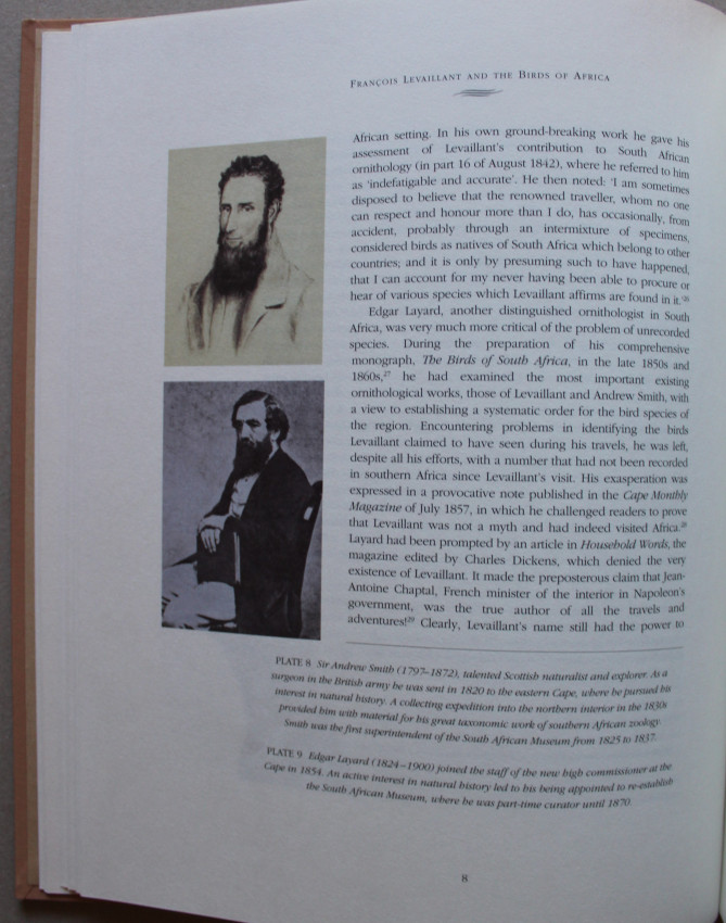 Intrepid traveller, pioneering naturalist, and famous author; Francois Levaillant (1753-1824) was a celebrity in his own lifetime . The colourful accounts of his travels in southern Africa in the 1780s were widely read in seven languages. His sumptuous bird books, published in a golden age of natural history book production, recorded for posterity his extensive bird collections. Yet he has often been dismissed as a flamboyant Gallic adventurer with a cavalier regard for the truth. This new study seeks to re-examine this controversial figure against the backdrop of the world of natural history and its practice in the late European Enlightenment. The potent mix of science and commerce is reflected in Levaillant's fascinated pursuit of knowledge of the animal kingdom and his active trade in specimens during the social and political upheavals of the early 18th century. (The Brenthurst Library)