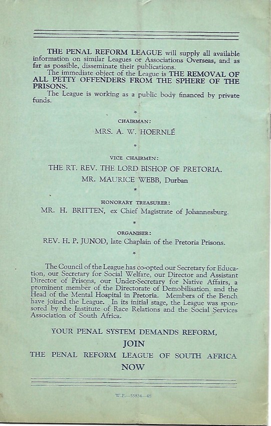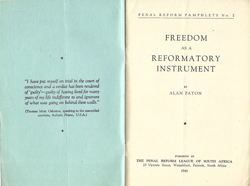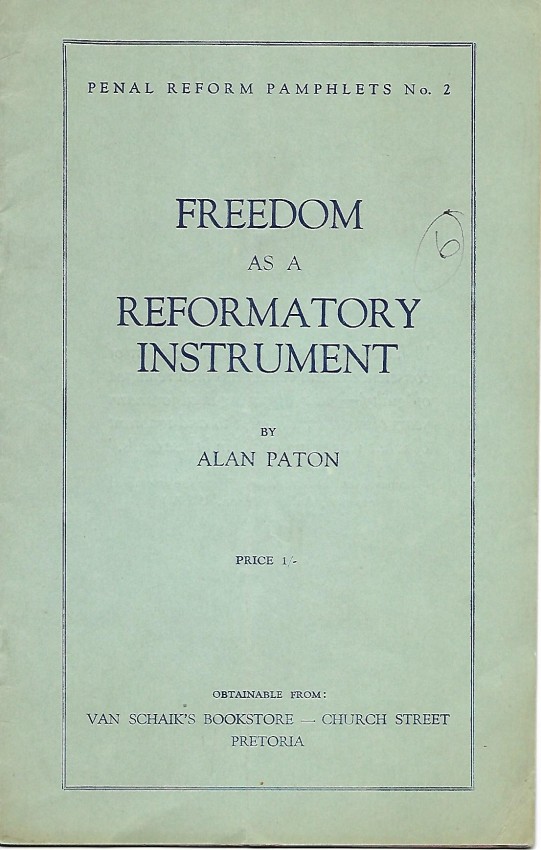 Very scarce early pamphlet published early in 1948, the same year as Cry The Beloved Country and probably preceding it, as it is not mentioned in the short biography of Paton in this pamphlet. Thus very possibly Paton's first solo publication. 16pp. In the original blue printed wraps. Penal Reform Pamphlet No. 2.