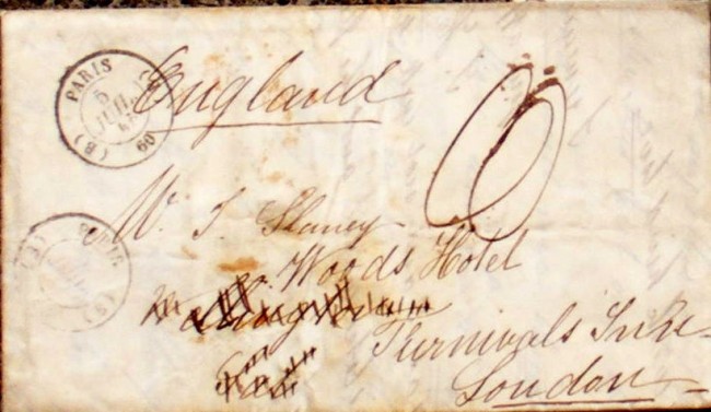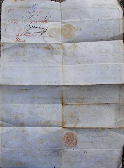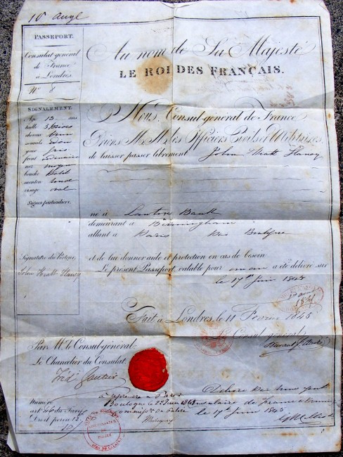 French Passport issued by the Consulate in London to one John Slaney, aged 13, on the 17th june 1841, with seal , police and interior ministry stamps, also includes two letters from John Slaney in Paris to England ( with postal marks and seals), passport measures 390 x 280mm, passport is single sheet document, usual minor wear & tear but overall condition:very good.