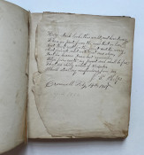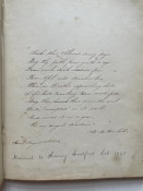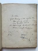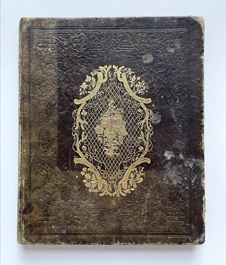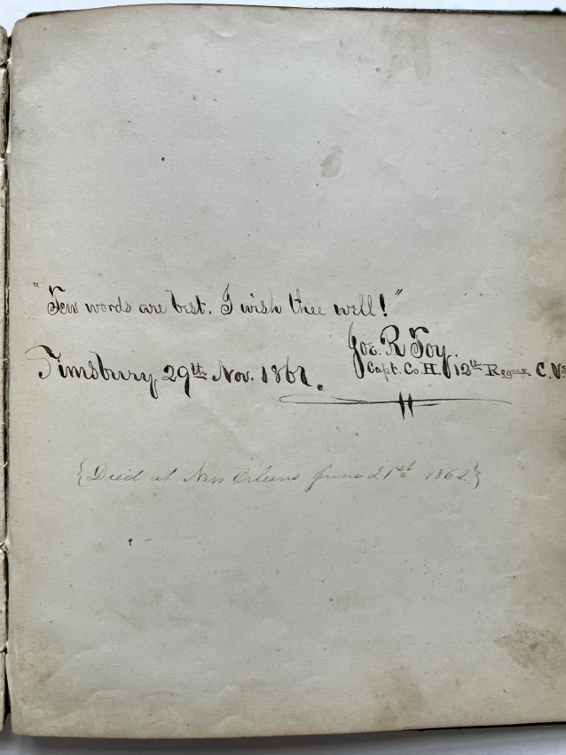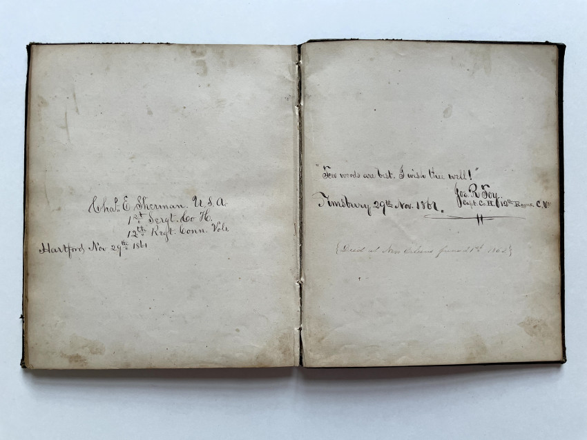 Includes numerous pencilled genealogical notes,. Civil War Album Amicorum, small full leather quarto, 44 pages filled with original poetry and various sentiments, two pages bearing the signatures of Charles E. Sherman, First Sergeant Company H., 12th Regiment Connecticut Volunteers, and Joseph R. Toy, Captain of the same Company and Regiment, both dated November 29th 1861. A note underneath Joe’s entry informs us that he died in New Orleans June 21st 1862.Good overall condition, one page torn but kept inside the album. Bears the J. C. Riker embossed stamp on front leaf.