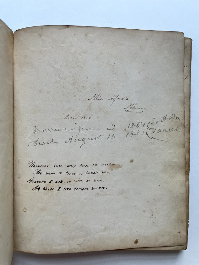 Althea (Allie) ALFORD, Friendship Album started in 1858, two pages with Civil War 12th Connecticut Soldiers sentiments.