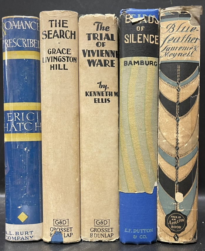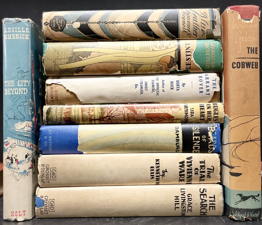 Dust Jackets: Selection of 10 older hardcover books with dust jackets with varying degrees of wear. Includes an early design by Bill English,