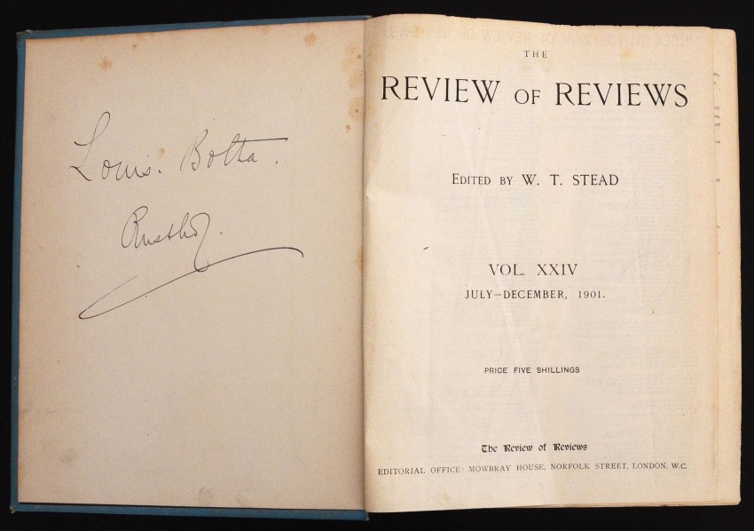 The issues of Review of Reviews published during the Boer War contained much coverage of the war, as does the issue on offer. The fact that Louis Botha was the General and Commander of the Transvaal army during the war, renders this volume from his own library and signed by him, an association item of great interest.