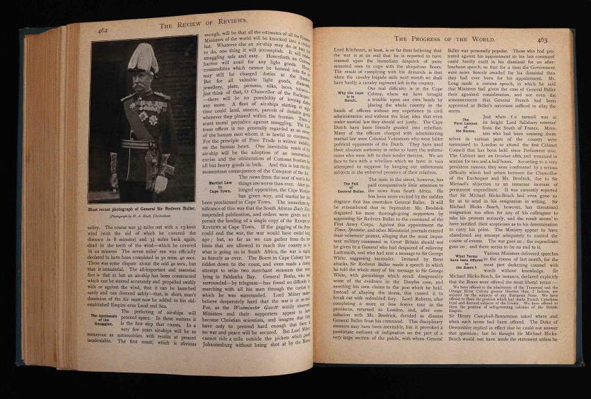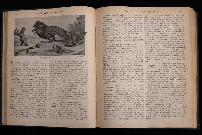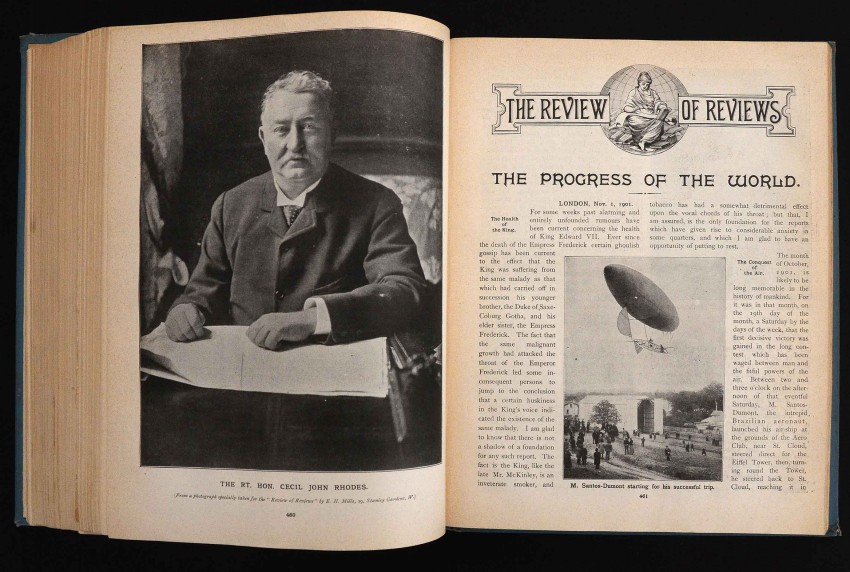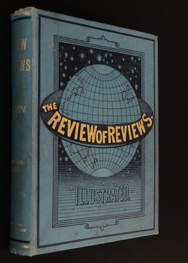 The Review of Reviews was a noted family of monthly journals founded in 1890-1893 by British reform journalist William Thomas Stead (1849 - 1912). Established across three continents in London (1891), New York (1892) and Melbourne (1893), the Review of Reviews, American Review of Reviews and Australasian Review of Reviews presented Stead's dream of a global publishing empire. Stead had previously been editor of the Pall Mall Gazette. He was a controversial character, profuse writer and is said to have written most of the Review of Reviews himself - a remarkable feat as the periodical contains a huge variety of material from biographical and historical to literary and current affairs. Stead was a feminist and friend of Olive Schreiner and published several of her writings. He was also a Boer sympathiser in the Anglo-Boer War.