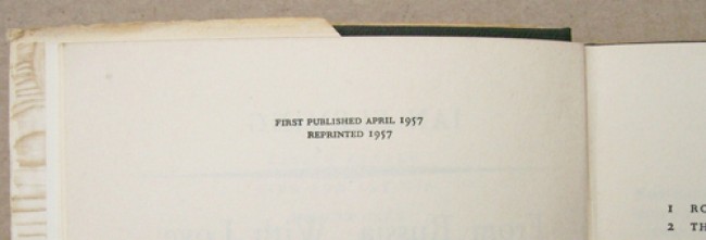 CONDITION DETAILS: The dust jacket has some scarring (insect damage?), especially on the spine and an ugly stain on the back. See image for the book seller label on the free front end paper and a stain that also marks the fore edge and a little on the dust jacket.