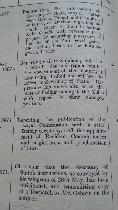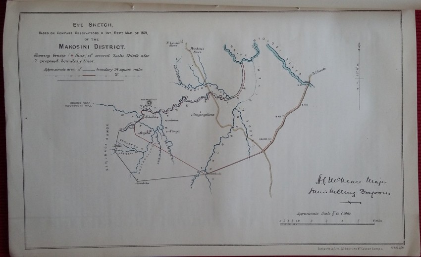 - Eye sketch, based on Compass Observations & Int. Dept Map of 1879, of the Makosini District (shewing graves of several Zulu Chiefs also 2 proposed boundary lines).
