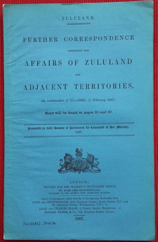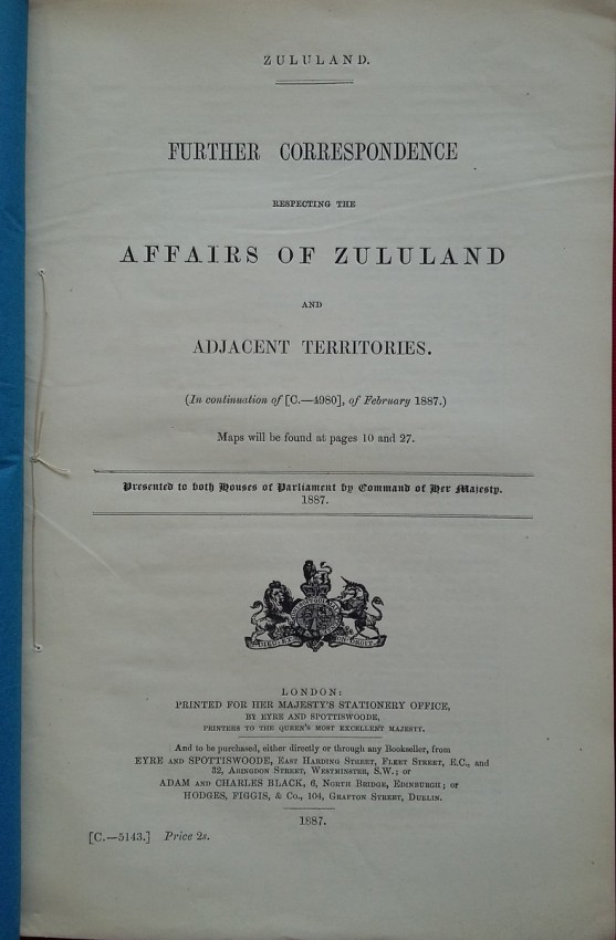 Blue paper wrappers; Collation complete - 66 pages + 3 maps (2 folding); British Parliamentary Paper C.-5143.; A clean copy.