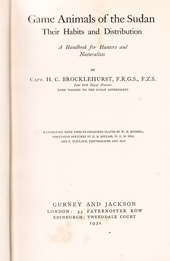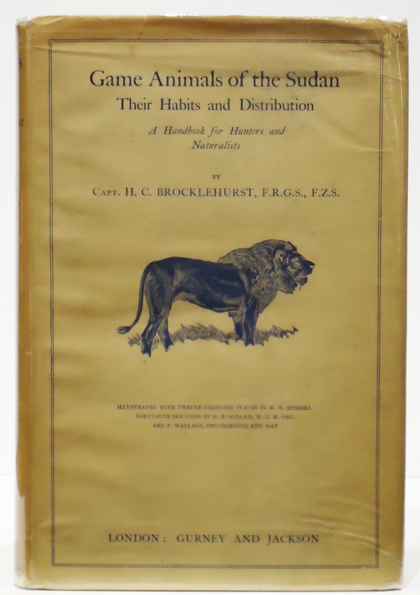 Czech (Kenneth) An Annotated Bibliography of Big Game Hunting Books 1785 - 1999 page 35 - 36 : "Read all you can about the animals you intend to hunt" writes Brocklehurst in his author's note. He ably describes all manner of big game, presenting them in alphabetical order from addax to Grant's zebra. The text is beautifully complemented by W.H. Riddell's coloured plates and life - size silhouettes of spoor. Included is a six page chapter titled "On Killing Elephant" by W.D.M. Bell