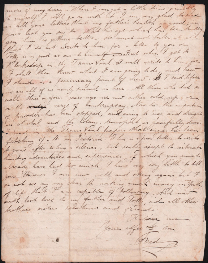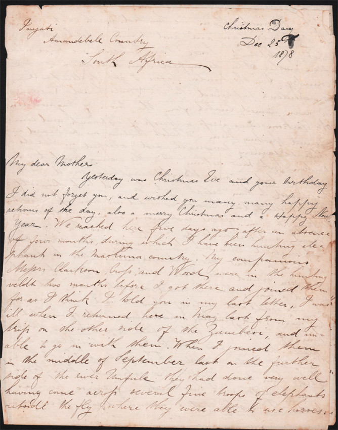 A 4 page letter written to his mother on Christmas Day 1878 from Inyati Amandebele Country. In it he describes in detail hunting elephants for four months in the Mashuna country and how he was ill when he returned. He mentions going to Potchefstroom to get provisions and ammunition for the next year’s hunt. He also refers to his financial situation which is not promising. A transcript of his letter is included.