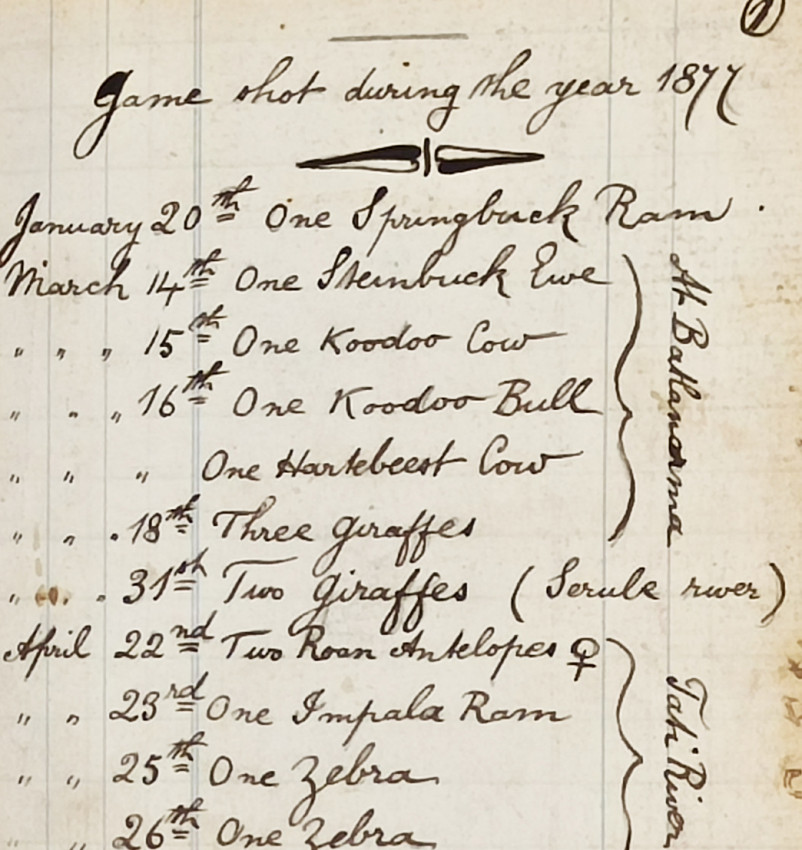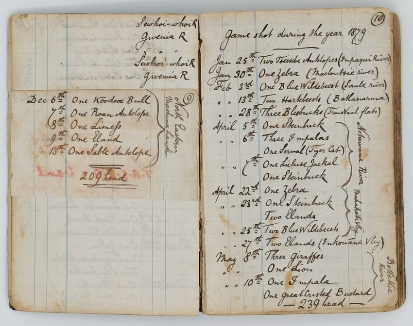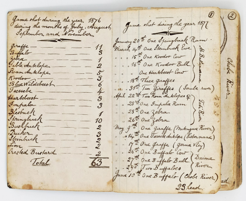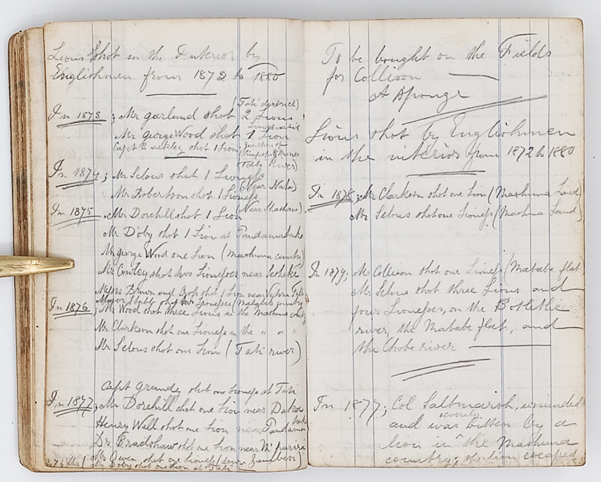 Accompanying these documents is a detailed descriptive analysis of the notebook and his life written by Mike Tucker entitled Frederick Courteney Selous’ hunting trips from 1876 - 1885 with records from his original game book which is retrieved here: