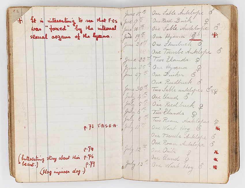Small full leather manuscript notebook (16mo 160 x110mm ) with marbled endpapers belonging to Selous, in which he details the game he has shot on hunting expeditions from 1876 – 1885. It also includes a section on his accounts and expenses. The front endpapers of the accounts section are torn at the top. The manuscript is in good condition.