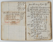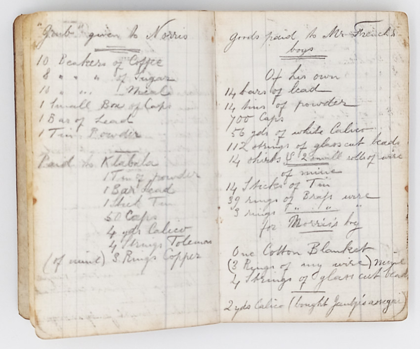 The notebook flips over to record his accounts and expenses from 1879 - Feb 1882. There are 135 unnumbered pages, mostly written on both sides. Here he describes in detail what he has bought - mainly provisions, or sold – ivory, skins and cartridges, and the amounts he paid or received.