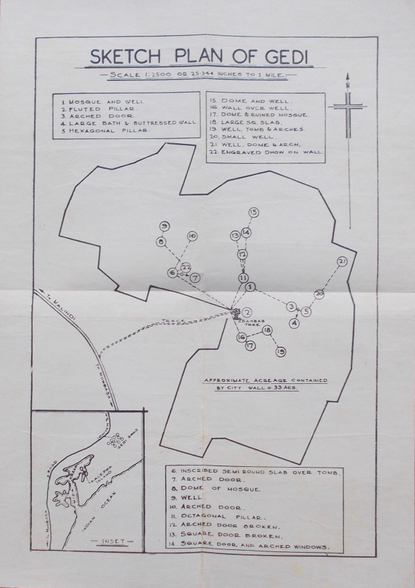 A guide to the ruins of Gedi near the Indian Ocean coast of Kenya. Gedi is one of many medieval Swahili-Arab coastal settlements that stretch from Mogadishu, Somalia to the Zambezi River in Mozambique. The site of Gedi includes a walled town and its outlying area. All of the standing buildings at Gedi, which include mosques, a palace, and numerous houses, are made from stone, are one-story, and are distributed unevenly in the town. There are also large open areas in the settlement which contained earth and thatch houses. Stone "pillar tombs" are a distinctive type of Swahili Coast architecture found at Gedi as well.