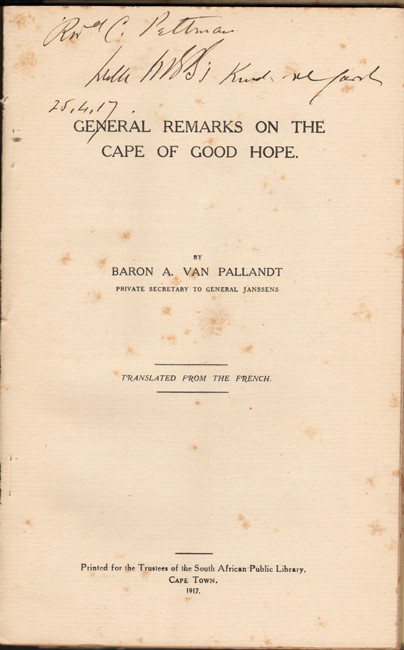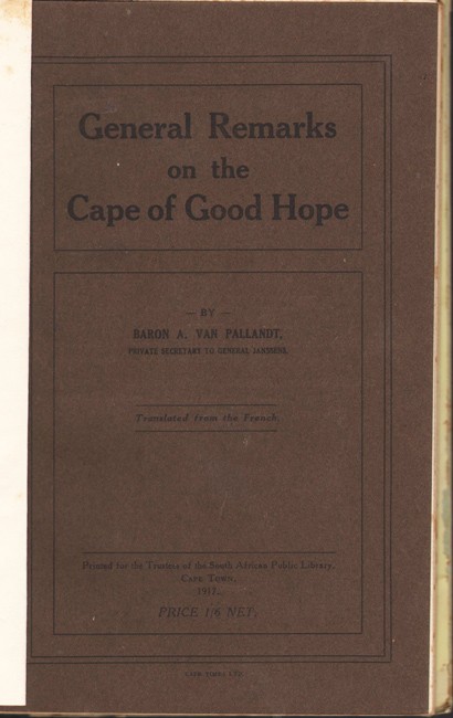 S.A.B.3: 618. 'The remarks concern mainly native policy and economic policy at the Cape. The author feels that the native races need Government protection, and contrasts unfavourably the Batavian Government policy with the policy of the recent British administration. Because of its censorious nature, De Mist ordered all copies to be destroyed - only one of the original copies survives in South Africa.'