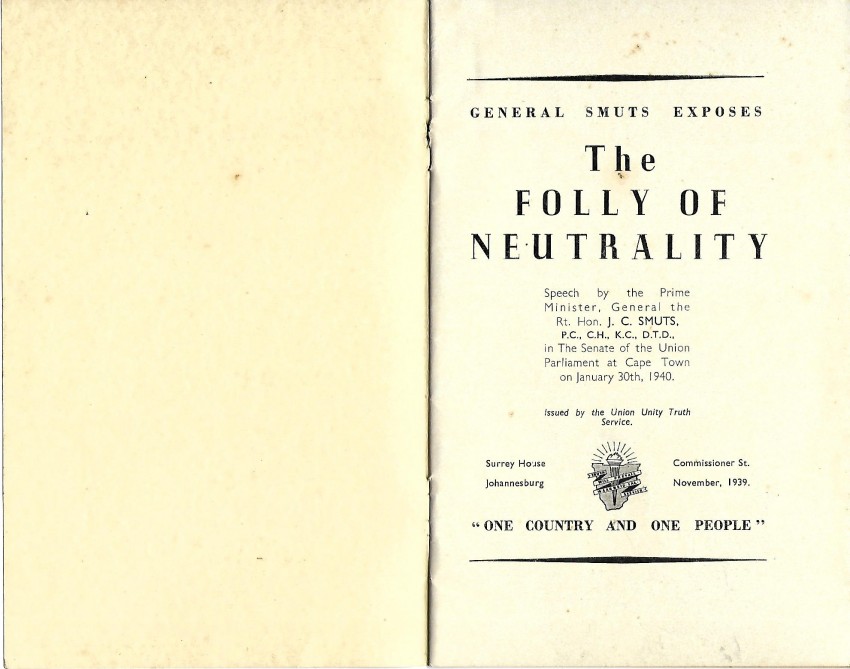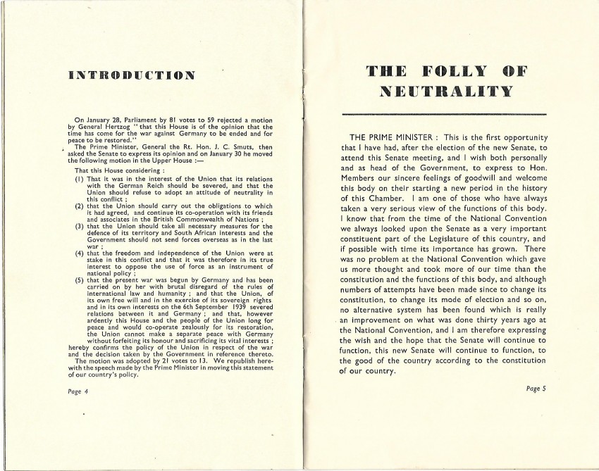 A 32pp pamphlet in the original wraps with a drawing of Smuts and Parliament of the front wrapper. Smuts's first address to the Senate after Hertzog's resignation and his appointment as Prime Minister. Strangely the pamphlet is dated November, 1939, two months before the speech was delivered. A near fine copy.