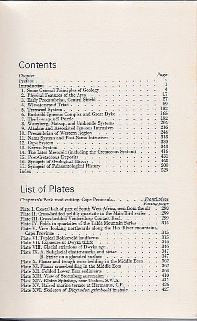 Long folding geological colour map of Southern Africa. Frontispiece showing Chapman's Peak road cutting. 16 photographic plates and 50 text figures that include diagrams, maps and photographs of fossils.